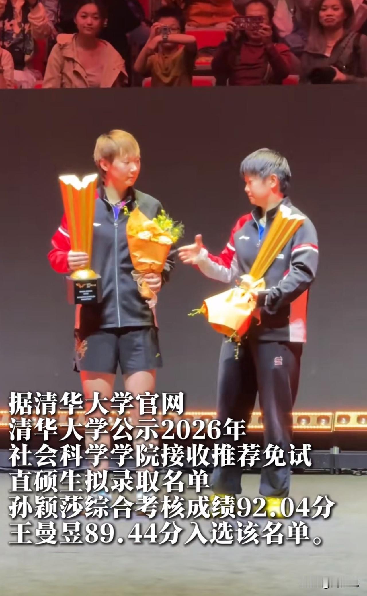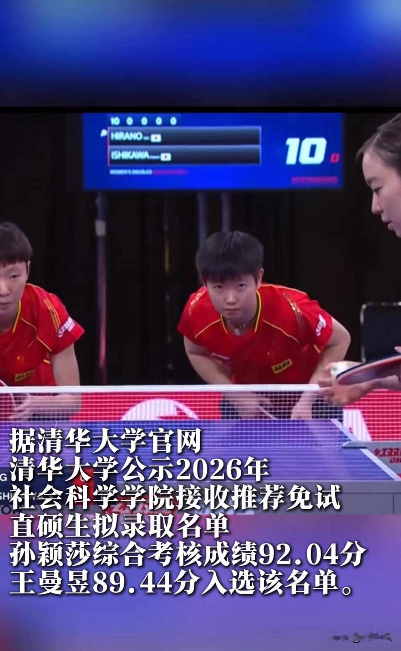 “孙颖莎、王曼昱被清华免试录取为直硕生!”据清华大学官网公示,2026年社会科学学院推荐免试直硕生拟录取名单中,孙颖莎和王曼昱赫然在列,其中孙颖莎综合考核成绩92.04分,王曼昱为89.44分,亮眼成绩印证了她们赛场外的实力。 此消息一出,众多网友纷纷表示,“这才是真正的偶像!既能在赛场挥汗夺冠,又能在课堂深耕不辍!” 在竞技体育的高光之外,周少不得不说孙颖莎和王曼昱用行动诠释了“文武兼备”的力量。她们没有因赛场成就停下成长脚步,这份对自我的高标准、严要求,比奖牌更具感染力。这样的青年榜样,值得被更多人看见和学习。 对于孙颖莎、王曼昱被清华免试录取为直硕生,大家怎么看呢?#寻美三湘# #长沙新朋友#