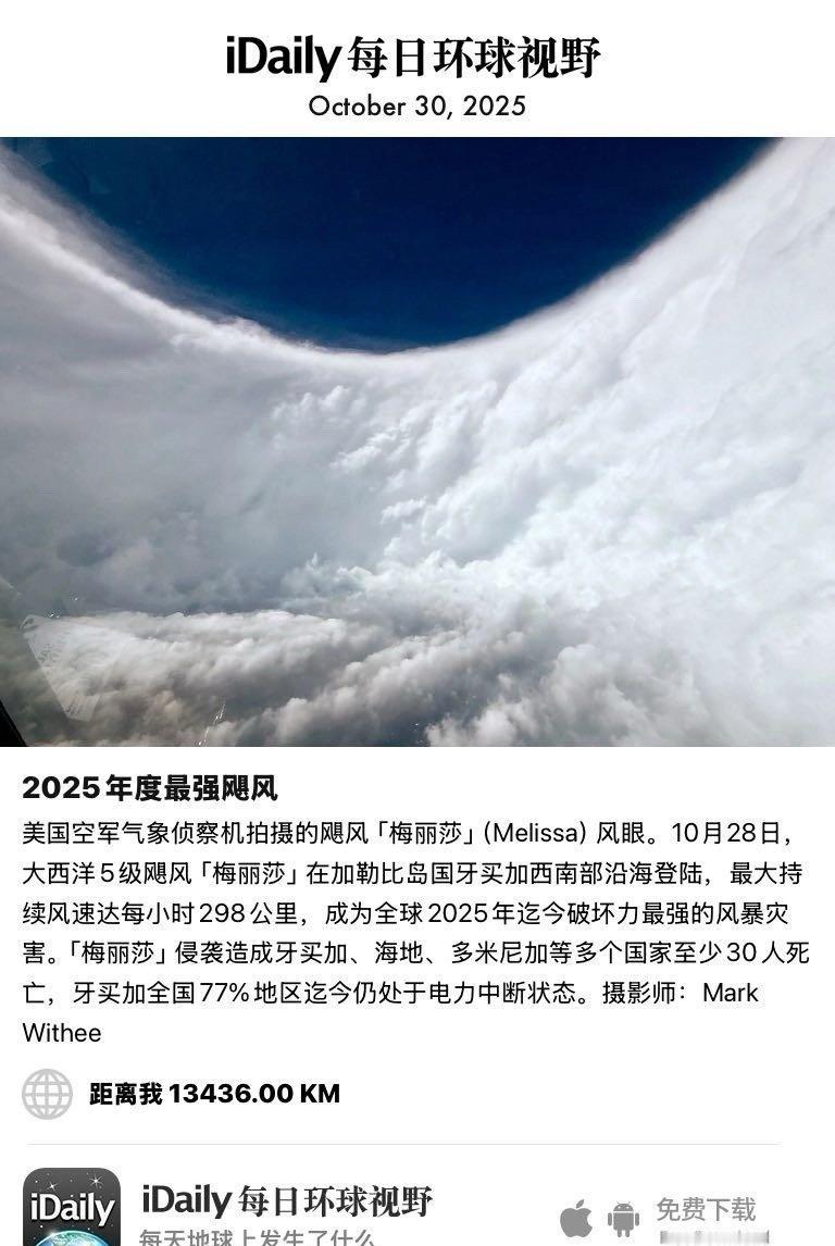 October 30, 2025 - 美国空军气象侦察机拍摄的飓风「梅丽莎」(Melissa)风眼。10月28日,大西洋5级飓风「梅丽莎」在加勒比岛国牙买加西南部沿海登陆,最大持续风速达每小时298公里,成为全球2025年迄今破坏力最强的风暴灾害。「梅丽莎」侵袭造成牙买加、 (来自iDaily每日视野) 网页链接