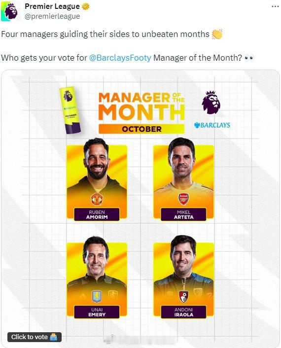 英超10月最佳主帅候选:阿莫林首次入选,阿尔特塔在列,大家觉得谁会当选呢? 金秋