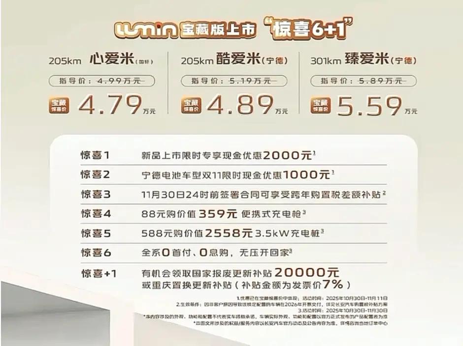 懂车之道讯懂车之道快讯,10月30日,长安Lumin宝藏版正式发布上市,共推出3款配置车型,售价区间为4.99-5.89万元,宝藏惊喜价为4.79-5.59万元。此次上市新车外观与内饰有小幅优化,对配置进行升级。动力方面,新车将全系搭载最大功率35千瓦的电机,匹配17.65千瓦时和28.08千瓦时两种容量的磷酸铁锂电池,CLTC工况续航里程分别为提升至215公里和310公里。安全配置增加车身稳定控制、坡道辅助、牵引力控制等。