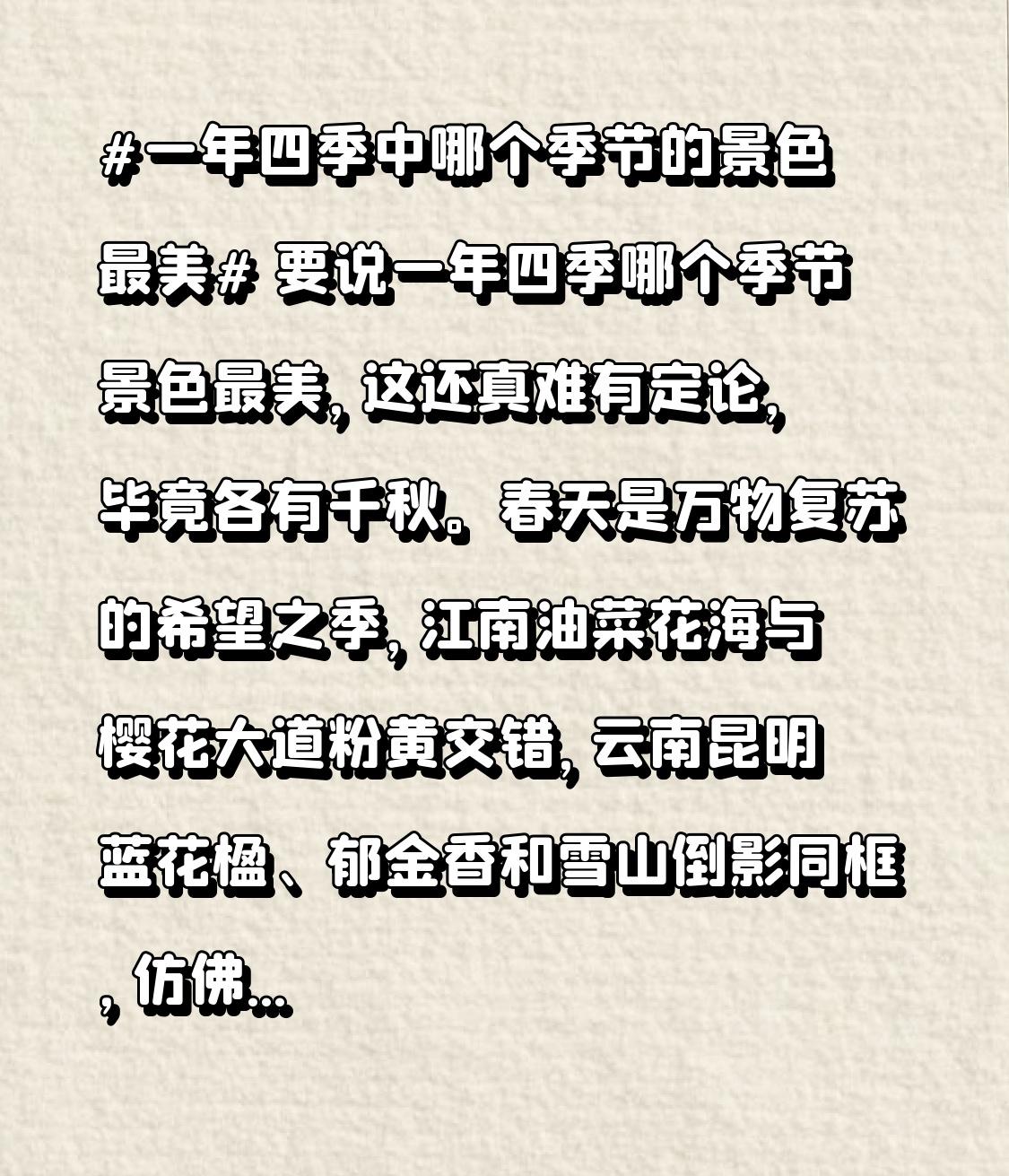 要说一年四季哪个季节景色最美,这还真难有定论,毕竟各有千秋。 春天是万物复苏的希望之季,江南油菜花海与樱花大道粉黄交错,云南昆明蓝花楹、郁金香和雪山倒影同框,仿佛给大地铺上柔软滤镜,特别适合爱清新治愈、爱拍照的人。 夏天热情似火,内蒙古呼伦贝尔草原绿浪滚滚,贵州荔波和湖北恩施的水上森林、玻璃海是天然空调房,想逃离城市闷热、体验“绿野仙踪”的人会对它青睐有加。 秋天层林尽染,吉林蛟河红叶谷、辽宁本溪关门山如打翻的调色盘,四川九寨沟彩林倒映海子,摄影控和色彩控定会沉醉其中。 冬天纯白静谧,银装素裹的世界别有一番韵味。每个季节都有独特魅力,美不美全看个人喜好。