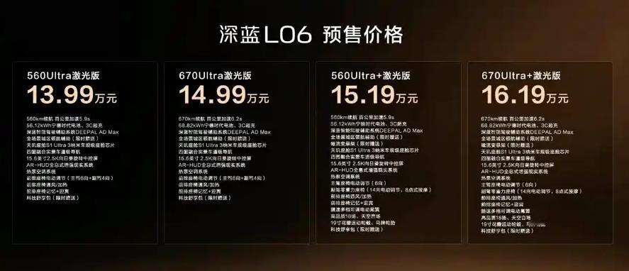 懂车之道讯懂车之道快讯,10月30日,深蓝L06正式开启预售,共推出4款车型,预售价区间为13.99-16.19万元。配置上将标配激光雷达,搭配3NM车规级座舱芯片、磁流变悬架等高端配置,采用纯电动力系统,最大续航里程为670公里。据悉,新车将于四季度内正式上市。