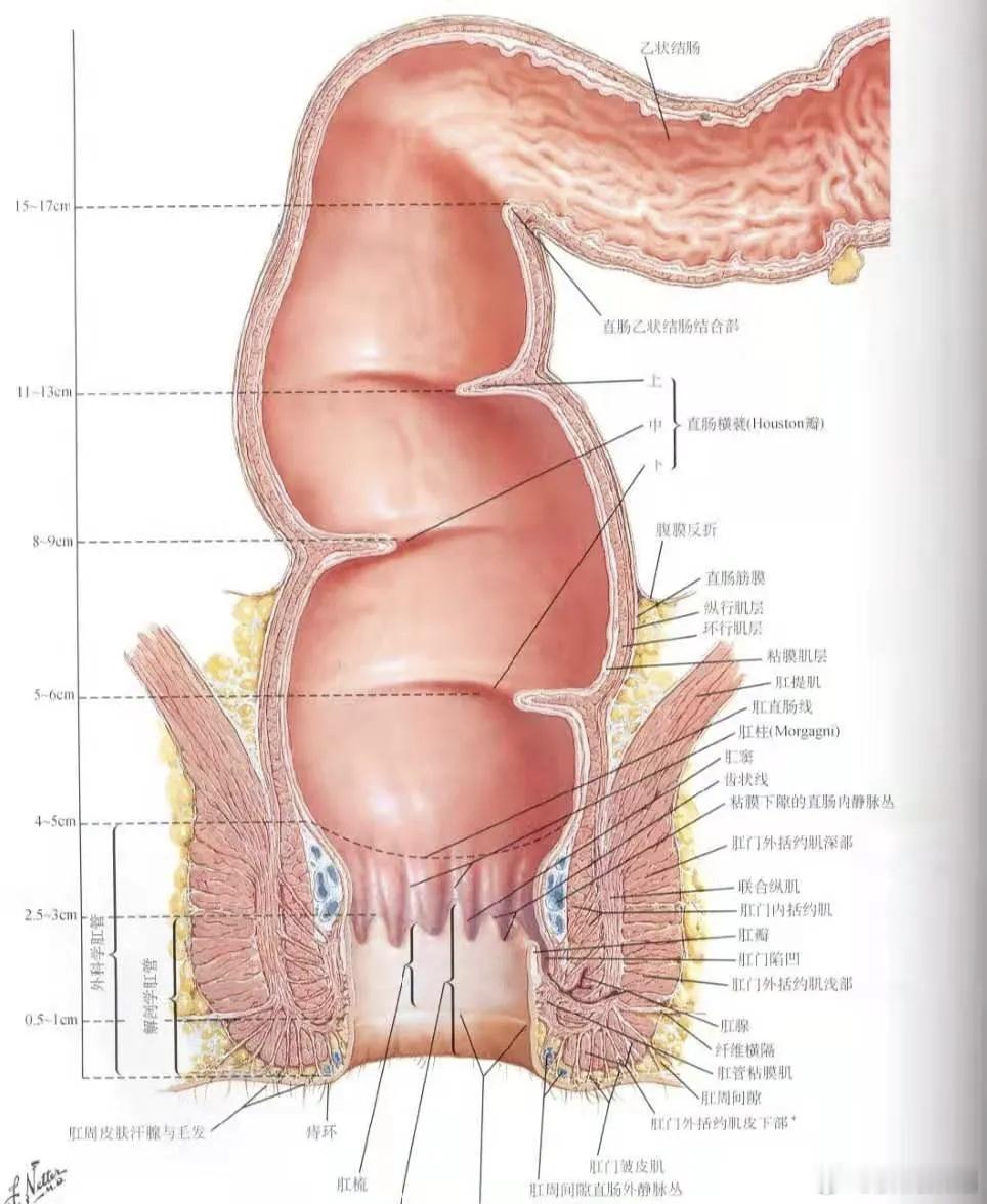 临床意义:齿状线是区分内痔和外痔的关键标志,内痔发生在齿状线以上,外痔发生在齿状线以下。在肛肠手术中,齿状线是重要的解剖学参考,手术操作应尽量避免损伤齿状线,以免导致术后肛门失禁等并发症。