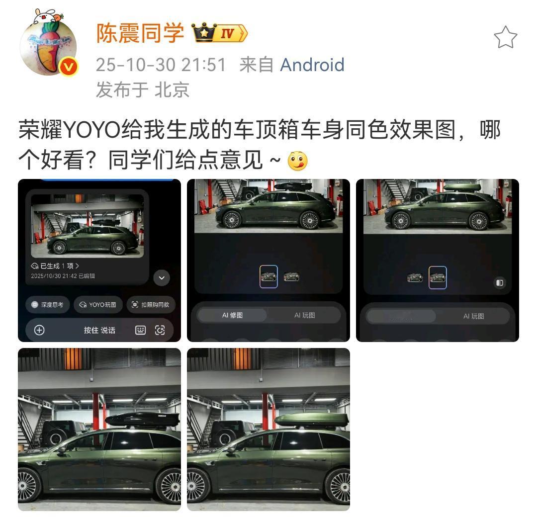 陈震:荣耀YOYO给我生成的车顶箱车身同色效果图,哪个好看?同学们给点意见~[大金牙] 个人感觉还是(图2)经过改装的车身同色设计更加的好看,当然黑色版本也非常的好看,因为黑色是一个百搭色什么样的都比较适合。 最好的还是原厂直接推出对应的颜色供大家选择,这样也不用后期再做喷涂了。 各位是怎么看的?欢迎评论区留言。