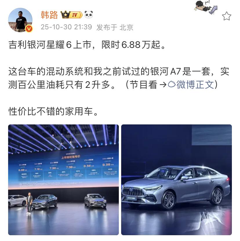 韩路:吉利银河星耀6上市,限时6.88万起!这个价格确实是杀疯了! 要知道这是混动车的价格,在前几年的时候,混动车的价格就没有低于10万的,现在不需要7万元就能到手。 而且现在某些地区还有置换补贴,把东西给搞满的话,那么此车的价格还能继续下探。 发现吉利银河这个出招真是非常猛,就是瞄准比亚迪的产品线,然后出一个价格比它更低更大的车。 各位是怎么看的?欢迎评论区留言。