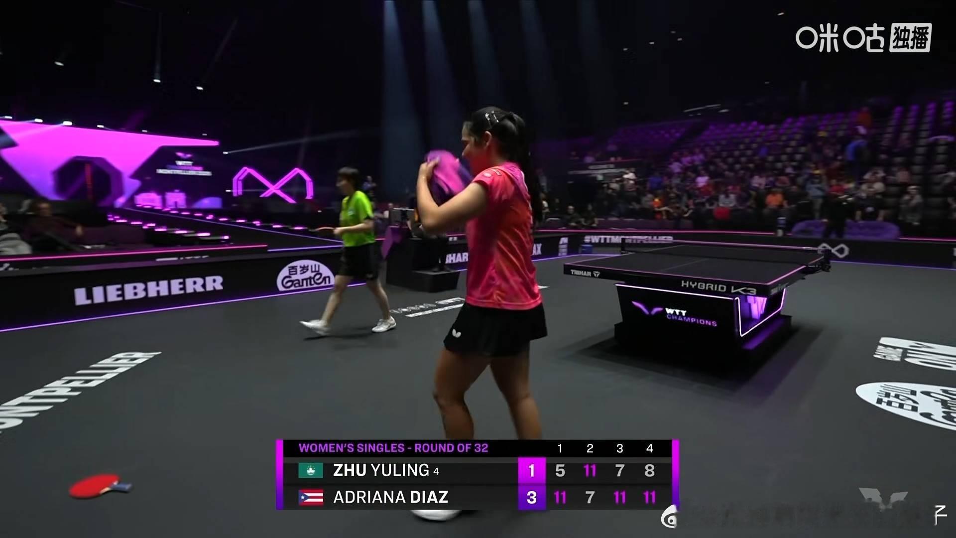 迪亚兹3比1朱雨玲(5,-7,7,8)晋级2025WTT蒙彼利埃冠军赛女单十六强