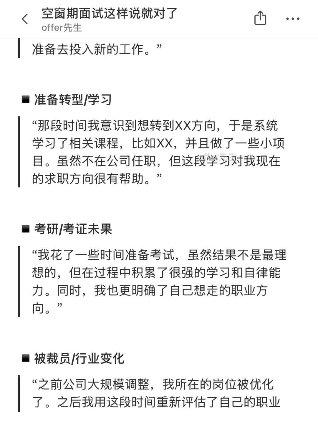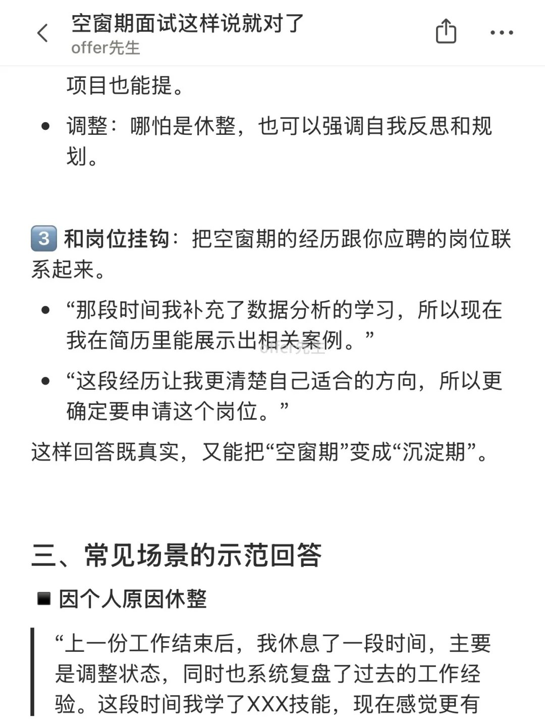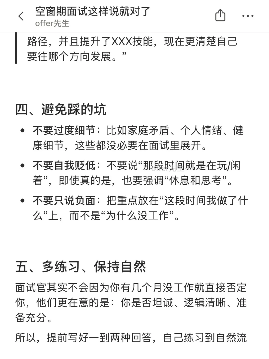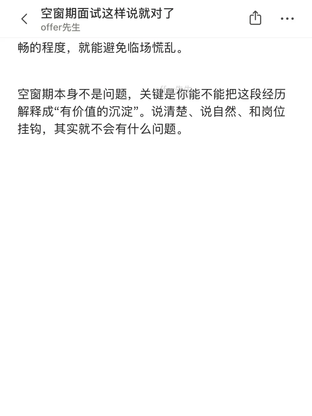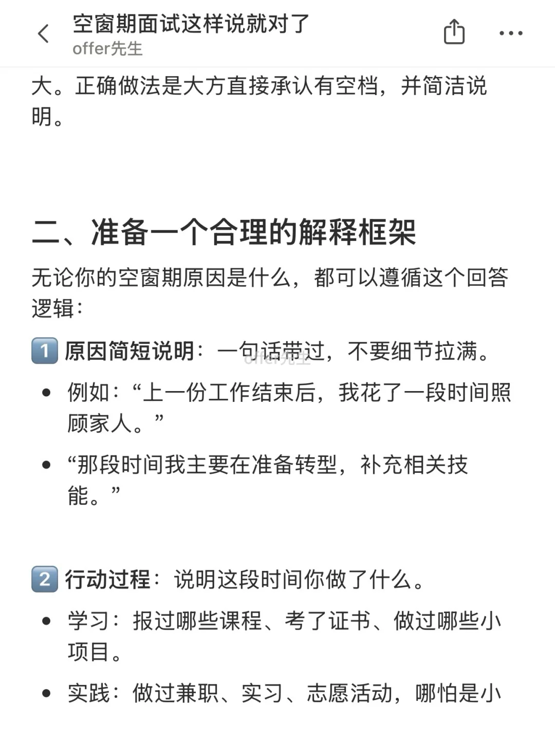 很多人在面试时最怕被问到一个问题:“你为什么这段时间没有工作?” . 简历上的空窗期就像是一个敏感点,很多候选人一紧张就乱解释,要么说太多细节,要么过度包装,结果反而让面试官产生疑问。其实,空窗期并不是大问题,关键在于你怎么说、真不真诚。 . ✅干货很多都放在图上了,希望大家都不要再因为空窗期焦虑 . 一个认真分享“找工作”干货的账号。真诚、有料、不说空话,只想用真实经历、具体方法,帮大家少走点弯路 .