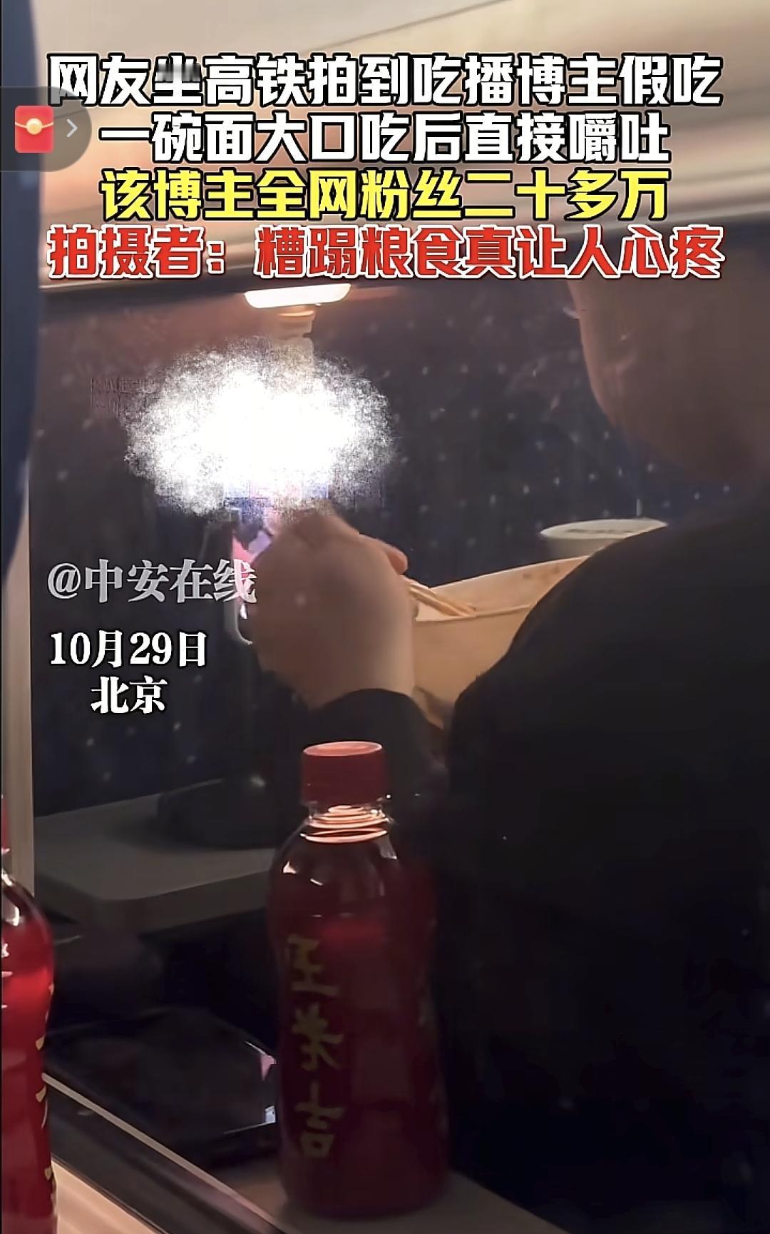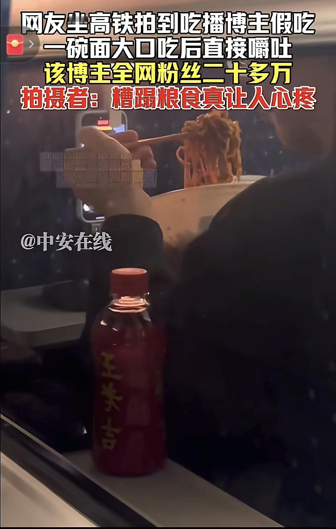 这位二十多万粉丝的网红还没找到吗? 在高铁上吃面,吃两口就吐掉,被车上乘客拍到了,这种人还能做吃播,也太假了吧! 真的是浪费粮食,袁老看到的话不知道会心寒成什么样,他为了让我们吃饱饭,一辈子都在研究如何增产,才有我们现在的衣食无忧,而现在这些吃播为了挣钱,为了流量在这浪费粮食,主要这还不是个别现象,还有好多大博主狂吃催吐,把吃东西当成是一种娱乐方式,说真的,这些所谓的“吃播”应该全方面禁止才是对!