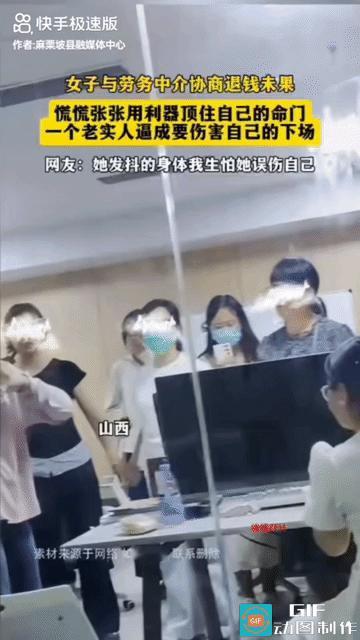 “把钱还我,不然也就死在这里!”山西,女子与劳务中介协商退钱无果,慌慌张张拿刀架在自己的脖子上,有人上来劝,被女子躲开了。而工作人员就坐在那里看着,无动于衷! 周围的人也都被这一幕吓到了! 看女孩的样子还很年轻,估计是工作不好找就去劳务中介寻求帮助,交了押金然后迟迟不给安排工作,或者安排的工作跟承诺的不一样。女子就想让他们退钱,他们不给,女孩被逼无奈才这样的。 看女子不停发抖得身体,真的无法想象她当时多害怕,多绝望,真的害怕她一个冲动做了傻事啊! 对此有网友说:我二月底通过中介进厂上班,签合同的时候说21一小时,满三个月一小时补两块钱,合同上也写了,给我签合同的中介还说外宿补贴一个月三百,上班一个月说降工价了,一小时19了,当时还问了中介那两块钱还有没有补,中介说有的有的,做满三个月离职了又不给补两块钱,外宿补贴也不给,报警什么的都没用,中介直接拉黑我了,当时是在58同城找的中介,合同在外面签的。中介拉黑我了又找不到他公司,没几天我在58同城翻来翻去又找到了那个人微信,找到了她公司,我老公直接拿了个喇叭去他公司闹,补回来两千六,当时签合同的时候他说有的补贴合同上没写,我老公叫他补上去还叫他按了手印,我老公去闹的时候还听见他老板骂他:都没听过有外宿补贴,你说就说,还写上去按个手印! 也有网友说:经过劳务公司介绍进厂,如果拿不到应得的工资,你们就不知道找劳动监察大队吗?有每天上下班考勤表的,还有,如果劳务公司不给工资,不要找劳务公司,最好报警直接找厂里。因为厂里要名声,如果事情闹大了,厂里就没兴誉了,所以厂里老板会直接找劳务公司,到时劳务公司在这个厂里招人就呆不下去了! 劳务中介是不是就像媒婆说媒,然后他们拿介绍费,工厂那边也有给费用,两头赚?如果是这样,那就好理解了,她为了你能去工作使劲的夸,把这个工作说的天花乱坠,但实际工厂根本就没这个福利,她有没办法实现。但反正给你介绍了,干不了是你的事,跟他们又没关系了,钱进口袋,想让他们再吐出来难啊! 需要工作就自己去找,为什么要相信网上这些人呢?真有那么好的工作还用通过劳务中介去介绍吗?早就抢完了或者内部消化了! 现在工作确实不好找,所以才要更加小心,他们抓住的就是你急着找工作的心理! 以前工厂招工都是直接招的,现在怎么要通过中介了呢?遇到被骗的情况,又该怎么讨回损失呢? (视频来源:麻粟坡县融媒体中心,侵删[祈祷])