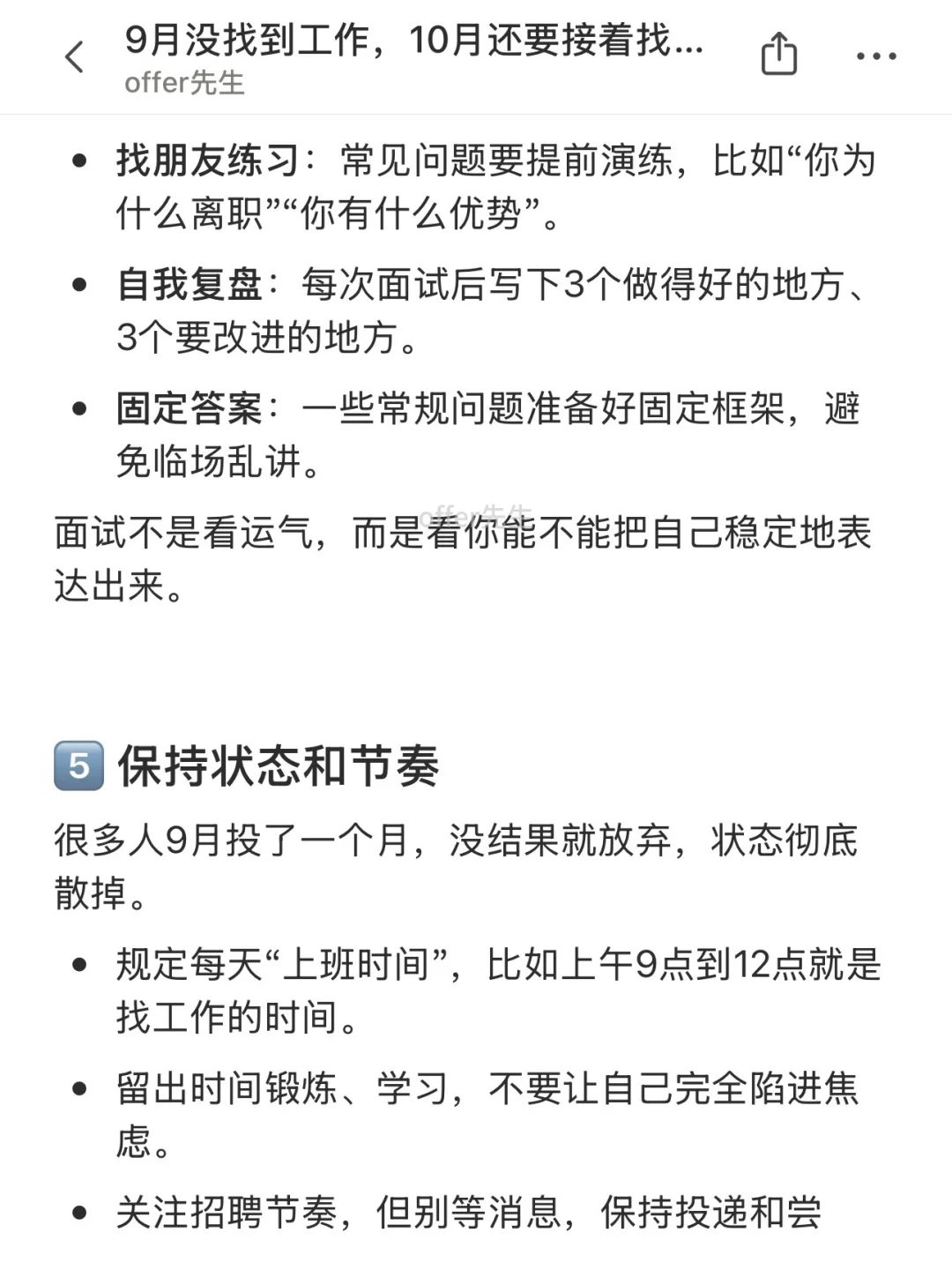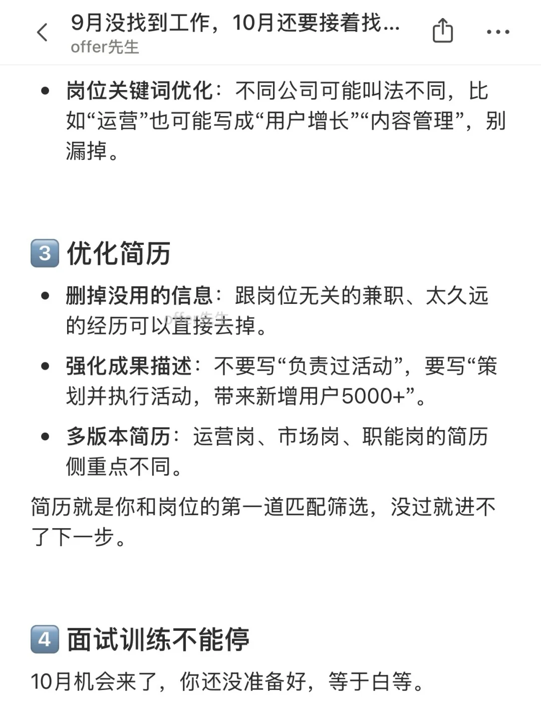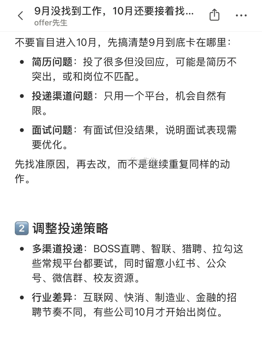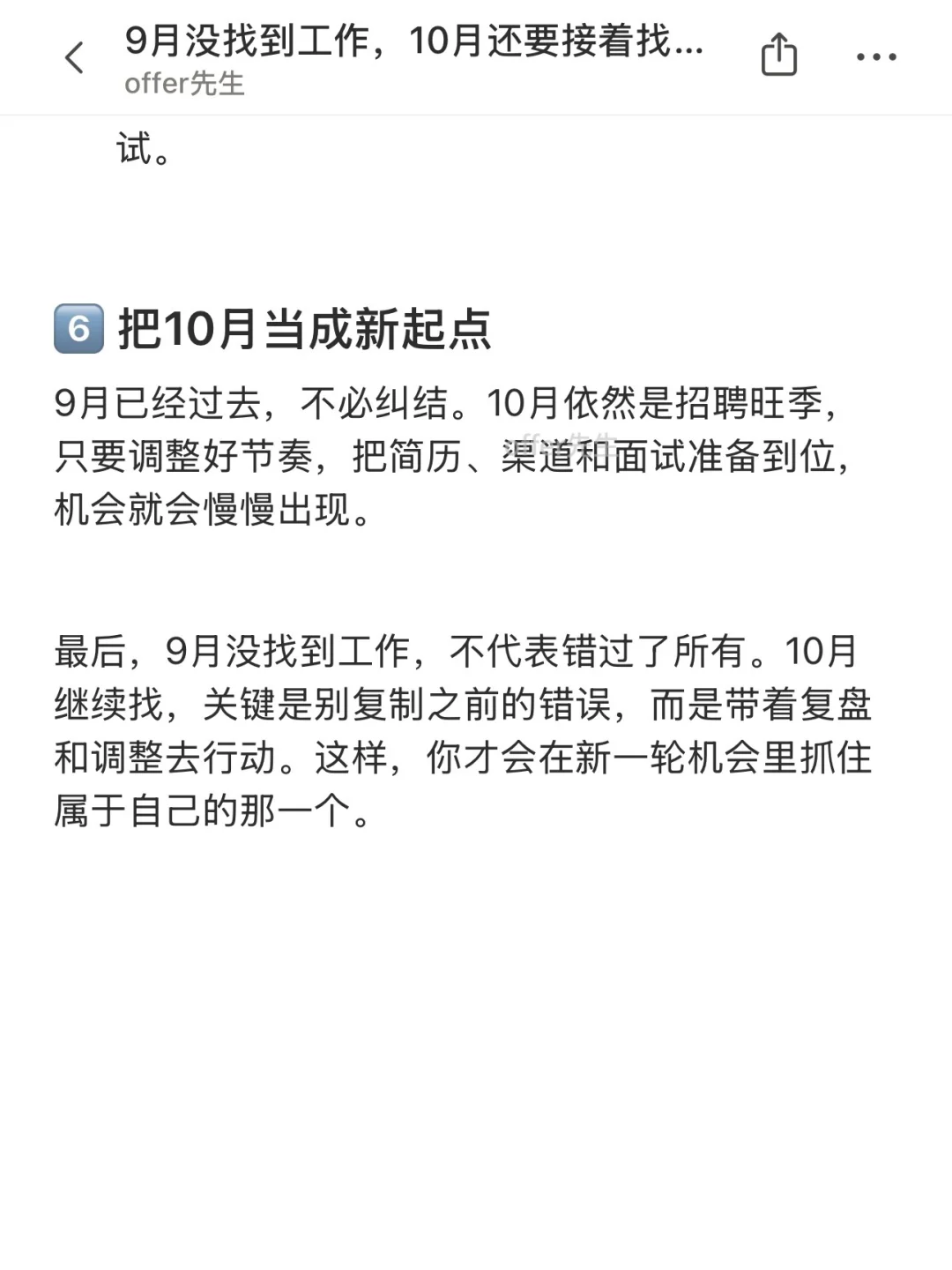 每年9月,秋招和社招的消息一波接一波。很多人把希望都压在“金九银十”,结果9月没拿到满意的机会,心里开始打鼓:是不是该停一停,等下一波? . 9月没找到工作,不代表错过了所有。👉🏻10月继续找,关键是别复制之前的错误,而是带着复盘和调整去行动。这样,你才会在新一轮机会里抓住属于自己的那一个。 . 一个认真分享“找工作”干货的账号。真诚、有料、不说空话,只想用真实经历、具体方法,帮大家少走点弯路 .