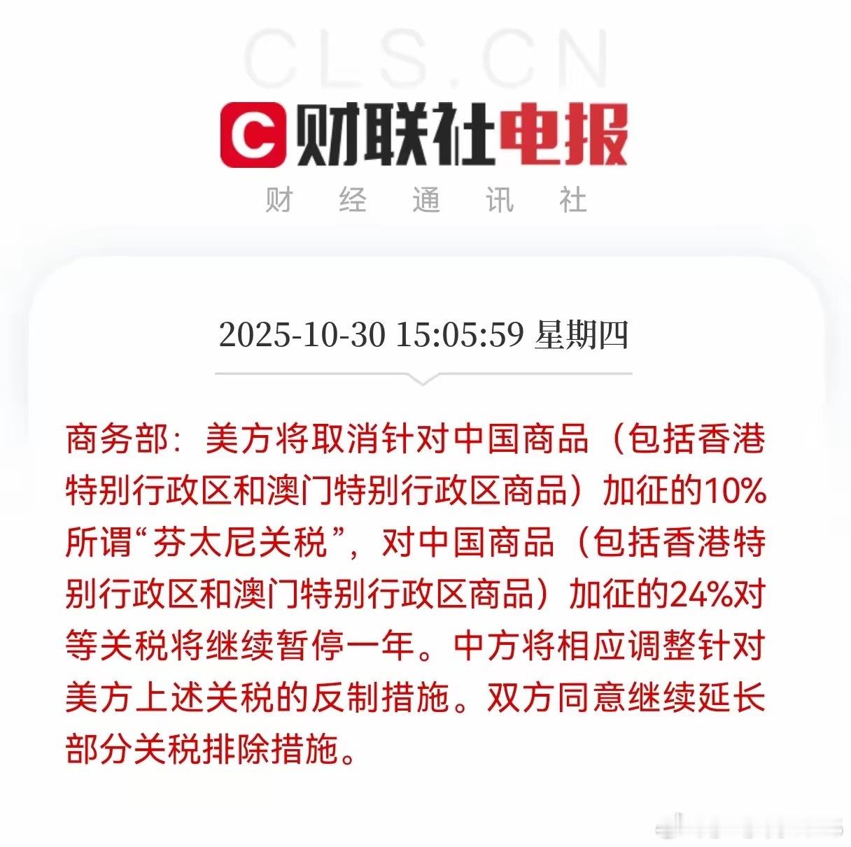 今天(2025年10月30日)商务部宣布,美方将取消对中国商品(包括香港、澳门特区商品)加征的10%所谓“芬太尼关税”,同时对中国商品加征的24%对等关税继续暂停一年。中方将相应调整对美方上述关税的反制措施,双方还同意继续延长部分关税排除措施。