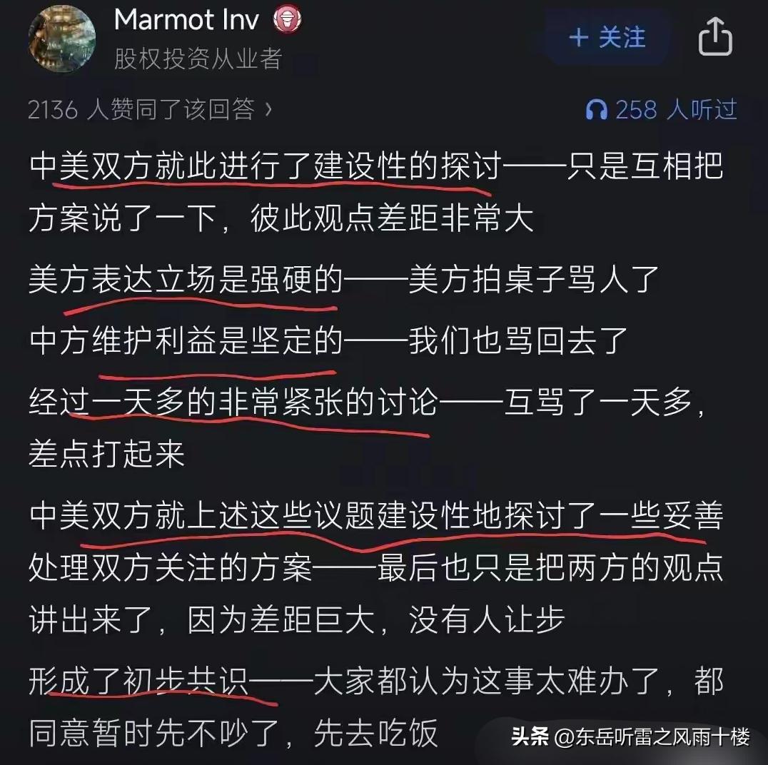 中美在吉隆坡的谈判有不少有意思的解读。官方表述说“中美双方进行了建设性的探讨”,这意味着开始讨论具体方案,但没“坦诚”“深入”,可见咱不太信美方说辞。“美方表达立场强硬,中方维护利益坚定”,就是美方拍桌子,咱怼了回去。 “经过紧张讨论形成初步共识”,最大共识竟是这事难办,先不吵去吃饭。谈判后美方代表就憋出“非常具有建设性”,还偷偷绕场走。 这次谈判框架刚搭好,协议还是半成品。中方用“形成初步共识”回应,美方加“非常成功”,谁更心虚,一目了然。