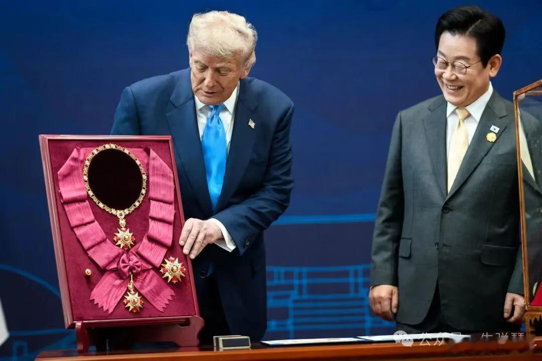 第二个细节,无穷花大勋章。又是金质大勋章。按照韩国的解释,这还是韩国的最高荣誉,特朗普也成为第一位获此殊荣的美国总统。特朗普果然很高兴,感叹:“它美得无与伦比,我真想立刻就戴上。”