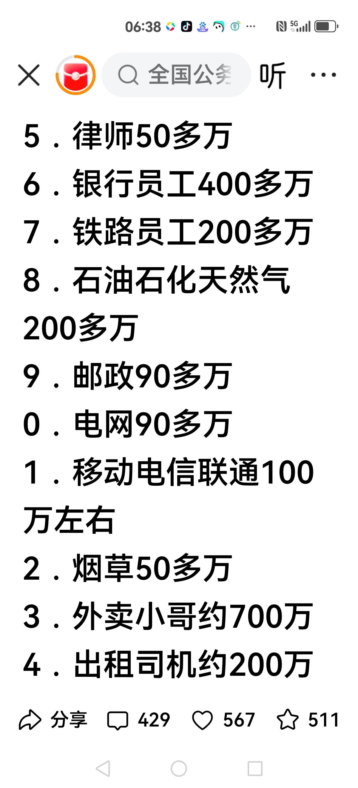 【人以类聚,物以群分】 看见这个榜单,你会明白,除了13外卖小哥,和14出租车司机以外。 其他行业除了律师,银行职员稍微弱点,都是铁饭碗。 婚姻起步就是看你是否在编制内,也就是编制内找编制内。 做生意找做生意的,那么省下的也只能在自己的圈子里找。