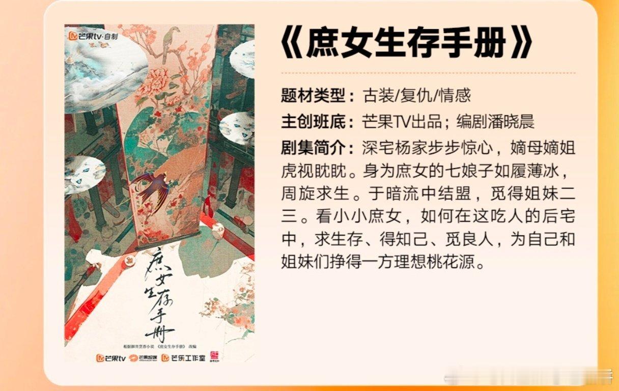 🍉《庶女生存手册》张晚意,祝绪丹,全伊伦,黄羿 这本原著算宅斗里蛮红的ip