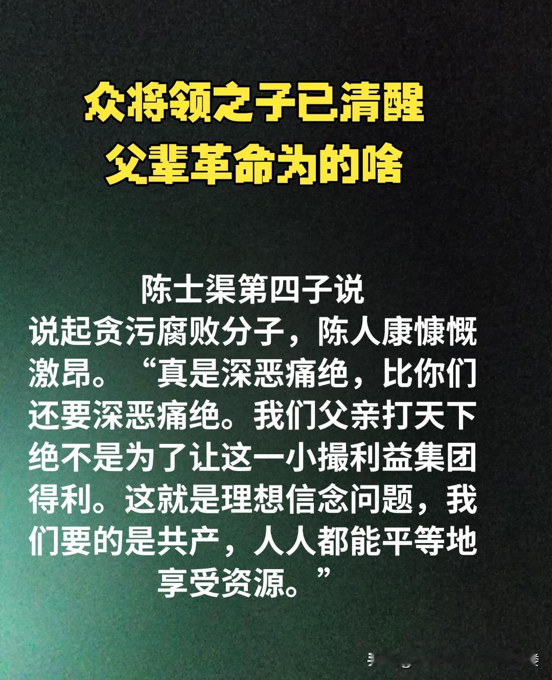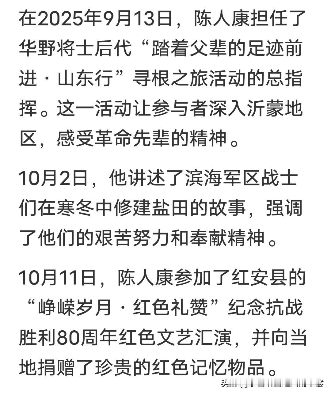 陈士榘是中华人民共和国开国上将,为革命事业奉献一生。他1927年入党,历经长征、抗日战争等,新中国成立后投身国防工程和“两弹”基地建设。 陈士榘之子陈人康感慨父亲一生坚定追随革命。毛主席曾召见失意的陈士榘,一句“要广而广之,多用刘邓”让他心里亮堂,此后他把组织安排放首位。陈人康说,父辈们奋斗的目标,不是为了个人财富与名利,而是为国家强盛、人民幸福,他们的精神值得永远铭记。 2025年陈人康可真是没少参加红色之旅活动。3月17日,他参加了“红色基因助力民营经济新发展”论坛暨“传承红色基因·踏寻先辈足迹”主题活动。这场在新疆库尔勒举办的活动,汇聚了众多开国将领后代。在那,大家一同感受老一辈革命家在新疆留下的光辉足迹和宝贵红色基因。 到了9月8日至13日,他又率领华野将士后代开启“踏着父辈的足迹前进·山东行”寻根之旅。他们走进齐鲁热土,寻访战场遗址,感受山东子弟兵精神。陈人康这一趟趟红色之旅,不仅是对先辈的缅怀,更是在传承红色精神啊。
