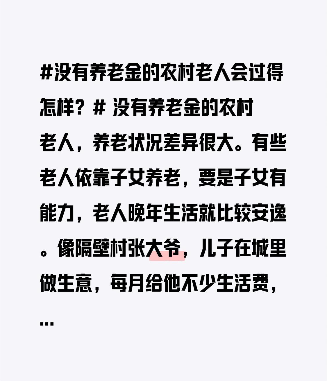 没有养老金的农村老人,养老状况差异很大。 有些老人依靠子女养老,要是子女有能力,老人晚年生活就比较安逸。像隔壁村张大爷,儿子在城里做生意,每月给他不少生活费,张大爷衣食无忧。但要是子女自顾不暇,老人生活就艰难了。 好在农村老人有宅基地、承包地和自留地。能劳动时,他们可以种点粮食、蔬菜,自给自足。不过上了年纪,劳动能力下降,生活质量也会受影响。70岁以上的老人能享受政府老龄生活补助,但金额有限。而且,现在乡村发展机会多,要是村里能发展好集体经济,或许能让老人们日子更好过些。