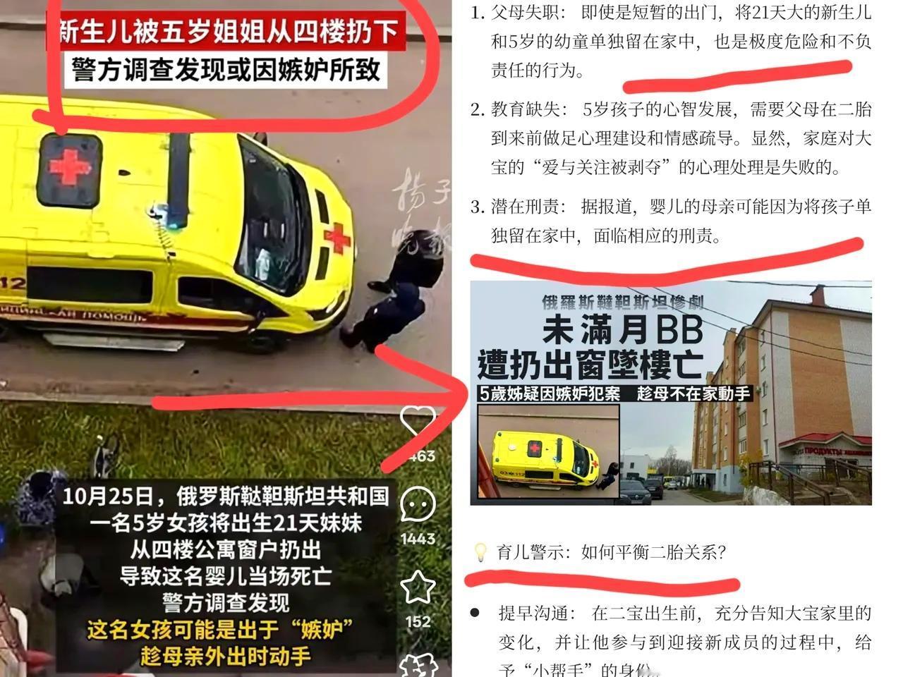 5岁姐姐,把才21天的妹妹 从4楼扔下的原因找到了, 不是天生坏,竟是她幼嫩脑子里的“解决方案”——以为“删掉”分妈妈的人,就能把妈妈抢回来。她根本不懂死亡是什么,只知道这个小不点来了之后,妈妈抱自己的时间少了。 很多二孩家庭的老大都会倒退,尿床、闹脾气,其实都是在喊“看看我”!可不少家长总说“你是姐姐要让着”,从没跟孩子说“妈妈爱你和爱妹妹一样多”。我们忙着给新生儿买新衣服、拍百天照,却忘了给老大一个踏实的拥抱,告诉她“你还是妈妈的宝贝”。 这哪是孩子的错啊,是家长没做好“爱的衔接”。你身边有二孩家庭吗?他们是怎么平衡对两个孩子的爱的?