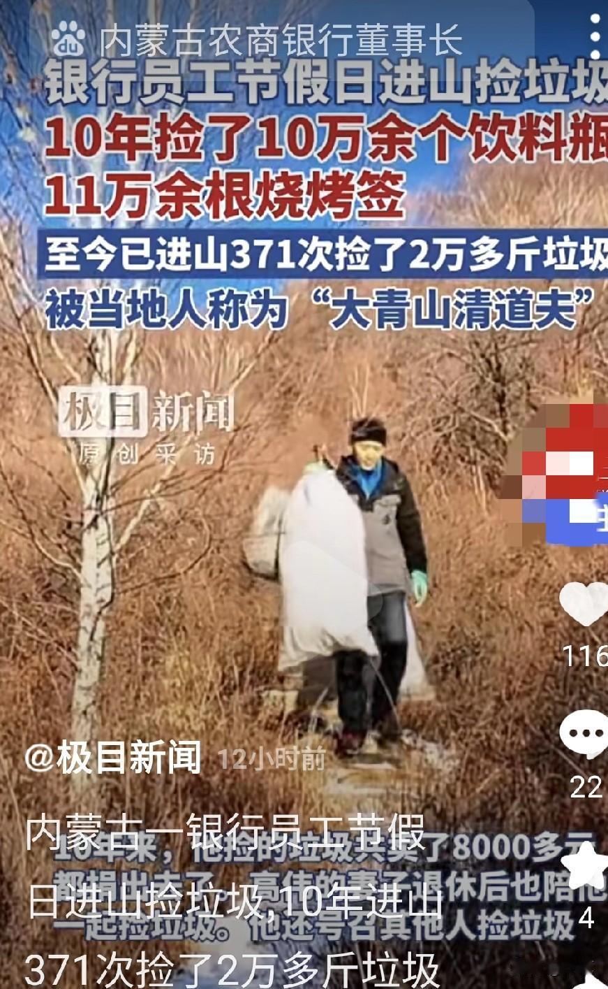 我一在想 怎么样文章内容才会有评论和点赞呢? 我前天发了一篇短文,写的是保护环境的公益人士 内蒙古呼和浩特 中国银行的高伟 连续十年上山 利用节假日捡垃圾, 捡了10万多个垃圾瓶,2万多斤垃圾,11万根烧烤签 至今进山371次 捡了2万多斤垃圾,后面他老婆退休后,他们一起捡, 每个周末他们都背着沉重的垃圾袋下山。 说到这里,我想对那些扔垃圾的人说,你们这样做不尴尬吗?!不脸红吗? 最后他们把捡垃圾卖的钱💰8000多元全部捐了。 你看看,他把捡的垃圾卖了废废品全部捐了! 这样爱护环境环保人士,三天过去了,刚好102个阅读,没有一个点赞,也没有一个评论。 我想说是我不需要你们点赞, 难道你们看过后不为这么好的人 这么好的环保人士评论说两句吗? 而不是默默地看完划过??? 这就是我们社会的现实 如此这样的好人,却被我们忽略,人们价值观,三观都出现很大的变化…… 这就是我们社会的悲哀啊! 但是我们的社会还是有这样很多普普通通的好人, 默默无闻的尽自己最大能 力所能及做着对社会对国家有益的事。 他们值得被我们这个时代歌颂。 他们是我们这个时代无名的英雄。 我想让更多人知道他的平凡事迹。