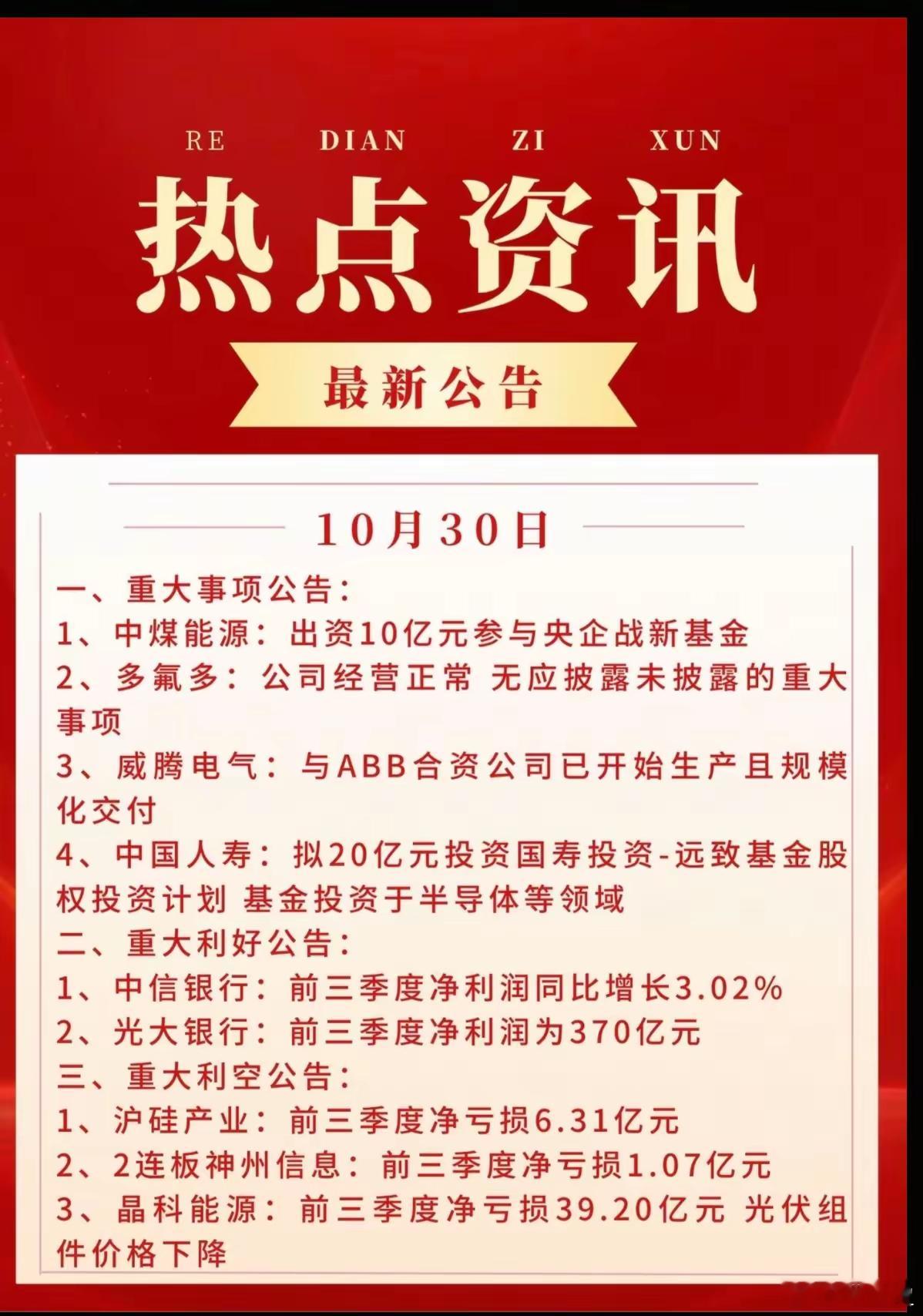 10.31周五早盘重要财经公告!重大事项公告重大利好利空公告部分上市公司三