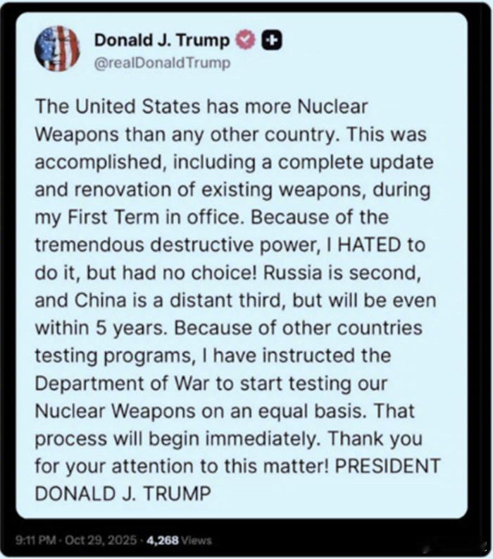 媒体朋友问我咋看特朗普发帖要恢复核试验?我说美顶尖的核武专家在特朗普的帖子下连发了八个帖子,指出特朗对核试验的认知错误以及前后矛盾之处。所以说,就是按有些媒体常用的“大妈军事”的逻辑推论,都很难评论特朗普到底想说啥哦[微笑]