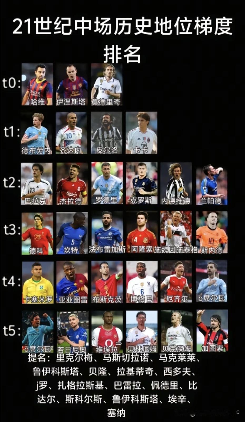 都来评价下这个21世纪中场球员历史地位的野榜吧!我就说哈维和伊涅斯塔这么厉害,一定都拿过金球奖吧? 如果是按照历史地位排名,那我给出的排名是: T0齐达内 T1莫德里奇 卡卡 哈维 伊涅斯塔 皮尔洛 T2兰帕德 杰拉德 托尼克罗斯 罗德里 西多夫 T3德布劳内 斯内德 亚亚图雷 坎特 博格巴 272 其它要么太久远比如:维埃拉 克里尔梅 斯科尔斯 贝克汉姆 巴拉克 内德维德 要么就是不够亮眼:法布雷加斯 布斯克茨 内德维德 巴拉克 卡塞米罗 阿隆索 小猪 b席 大卫席尔瓦 加图索 德科。