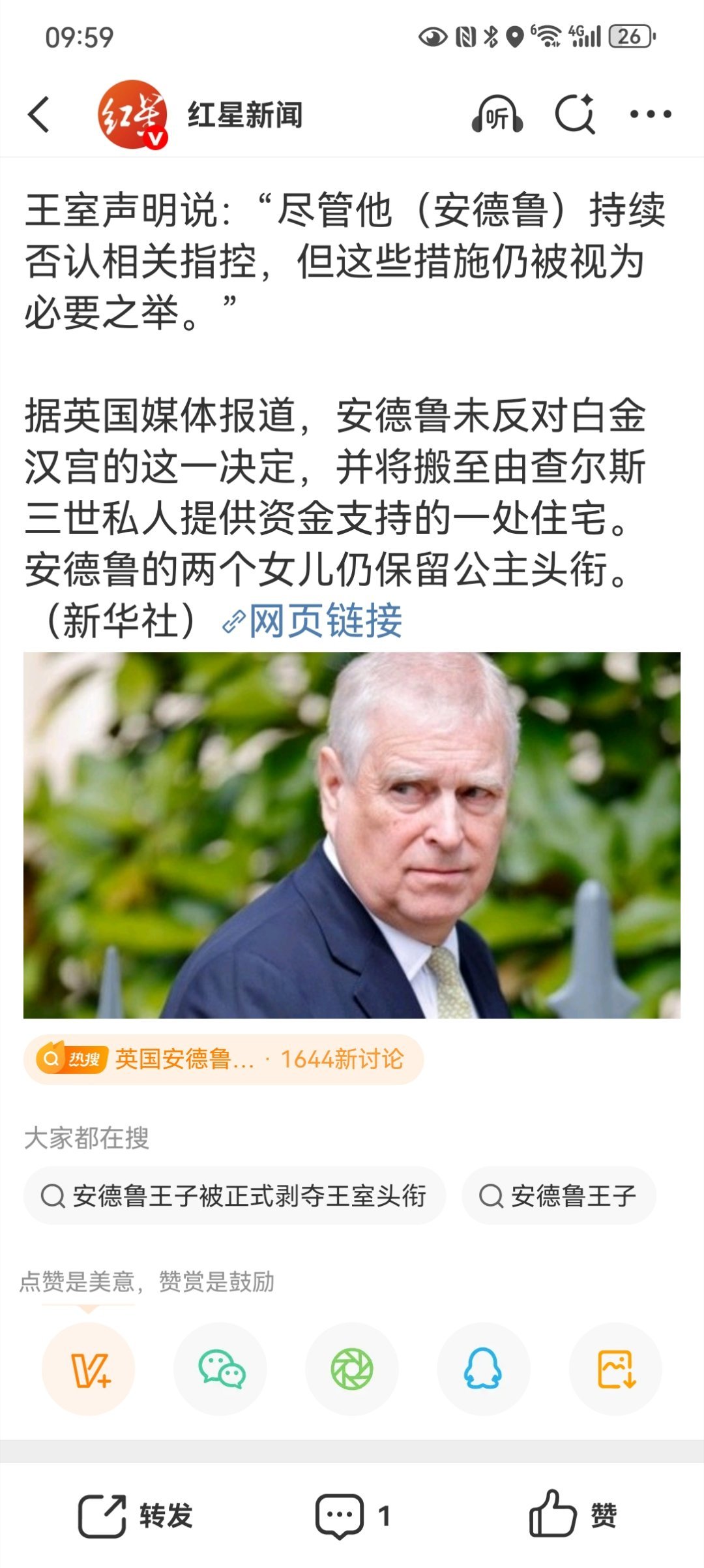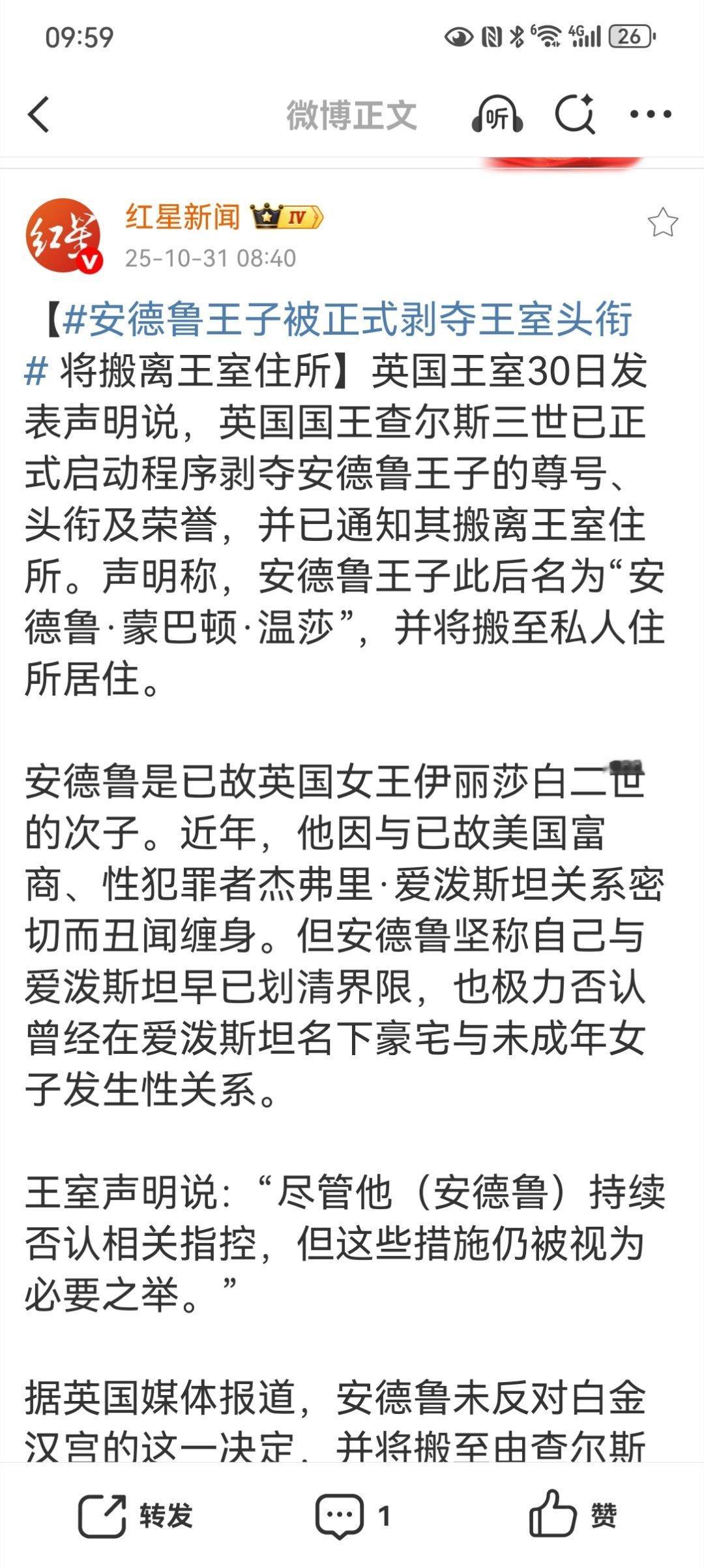 英国王室此举展现了维护声誉的果断决心。通过与丑闻缠身的成员切割,有效捍卫了王室尊严,这种“壮士断腕”的举措值得肯定。同时允许其女儿保留头衔,体现了责罚分明的智慧——既清算当事人的过错,又不株连后代,为王室形象管理树立了精准施策的范例。