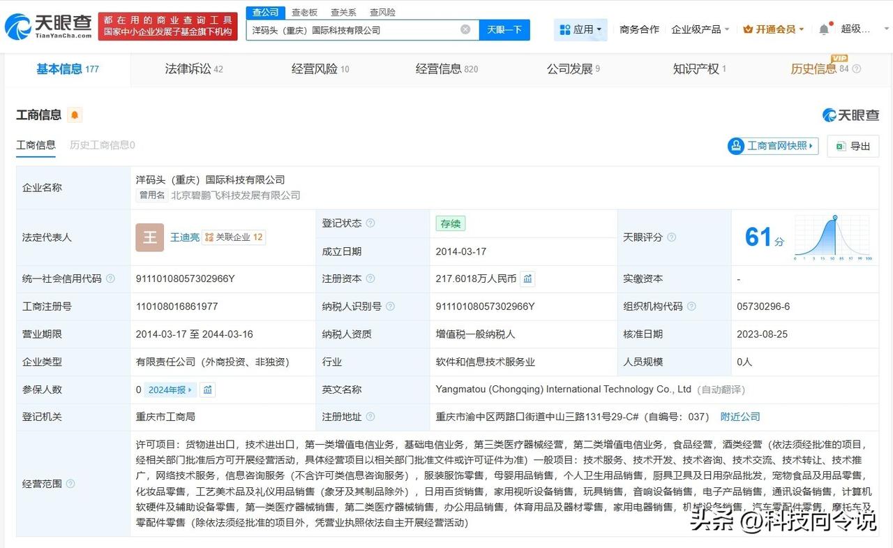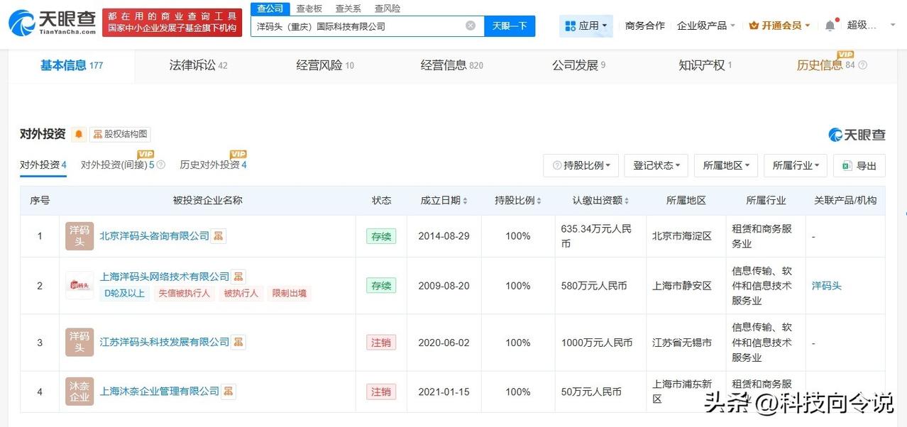 【洋码头重庆国际科技公司经营异常 洋码头母公司经营异常】 天眼查App显示,近日,洋码头(重庆)国际科技有限公司因通过登记的住所或者经营场所无法联系,被重庆市渝中区市场监督管理局列入经营异常名录。 该公司成立于2014年3月,法定代表人为王迪亮,注册资本约217.6万人民币,经营范围包括货物进出口、技术进出口、食品经营、酒类经营等,由SAIF IV Logistics (BVI) Limited、上海羽怡企业管理合伙企业(有限合伙)等共同持股。对外投资信息显示,该公司全资持股上海洋码头网络技术有限公司。 天眼查信息: