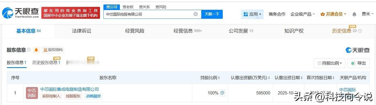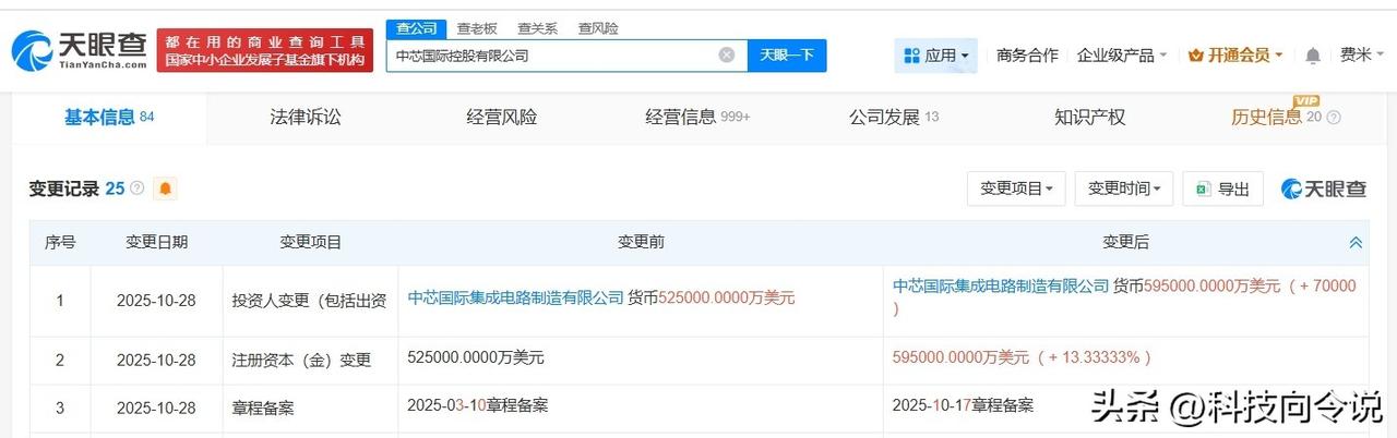 【中芯国际控股公司增资至59.5亿美元 增幅约13%】 天眼查App显示,近日,中芯国际控股有限公司发生工商变更,注册资本由52.5亿美元增至59.5亿美元,增幅约13%。 该公司成立于2015年7月,法定代表人为刘训峰,经营范围包括集成电路产品的批发、进出口、佣金代理及相关配套业务等,由中芯国际集成电路制造有限公司全资持股。 天眼查信息: