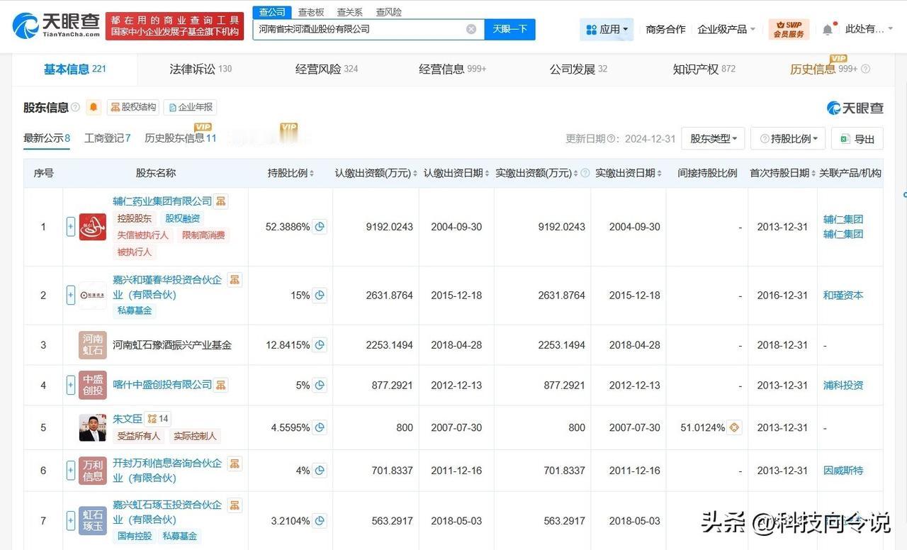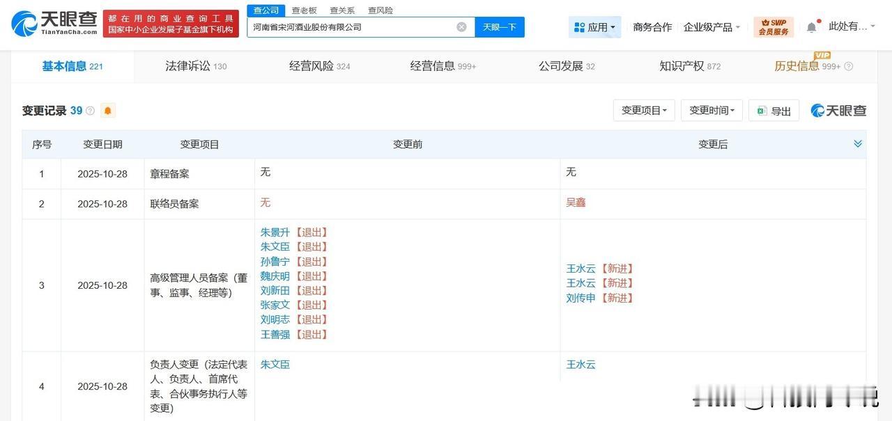 【朱文臣卸任宋河酒业董事长 宋河酒业发生高管变更】 天眼查App显示,近日,河南省宋河酒业股份有限公司发生工商变更,朱文臣卸任法定代表人、董事长,由王水云接任法定代表人并担任董事、总经理,同时,多位高管均发生变更。 河南省宋河酒业股份有限公司成立于1999年8月,注册资本约1.75亿人民币,经营范围为白酒酿造、销售,中国老子养生酒、虫草酒酿造销售,由辅仁药业集团有限公司、嘉兴和瑾春华投资合伙企业(有限合伙)、喀什中盛创投有限公司、朱文臣等共同持股。 天眼查信息: