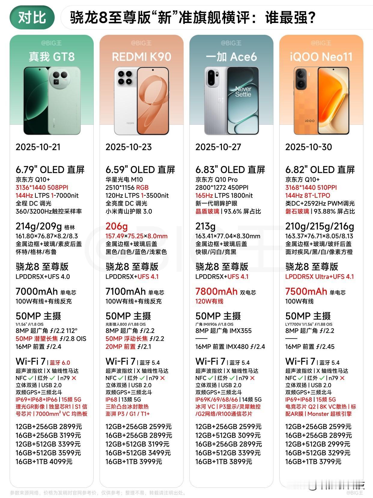iQOO Neo11 能刷出这个价格那就闭眼冲吧! 如果是官网原价那对比近期同价位的几款新机确实没啥优势,但这个价格是真有点香了~ 首先就是一块 6.82 英寸 2K 144Hz 8T LTPO 大直屏,这个在同价位是真的很能打; 再是骁龙 8 至尊版 + 9600Mbps LPDDR5X + UFS 4.1 三件套,性能直接拉满; 最后还有7500mAh 电池+100W 有线闪充,还支持全局直驱供电,无论是续航还是补能都相当优秀。 当然同价位中,REDMI K90的音质+长焦、一加Ace6的超强续航组合、真我GT8的2K屏+影像联名,也都是不错的亮点~ 都可以对比的看看,如果能刷出真香价格,都值得考虑。