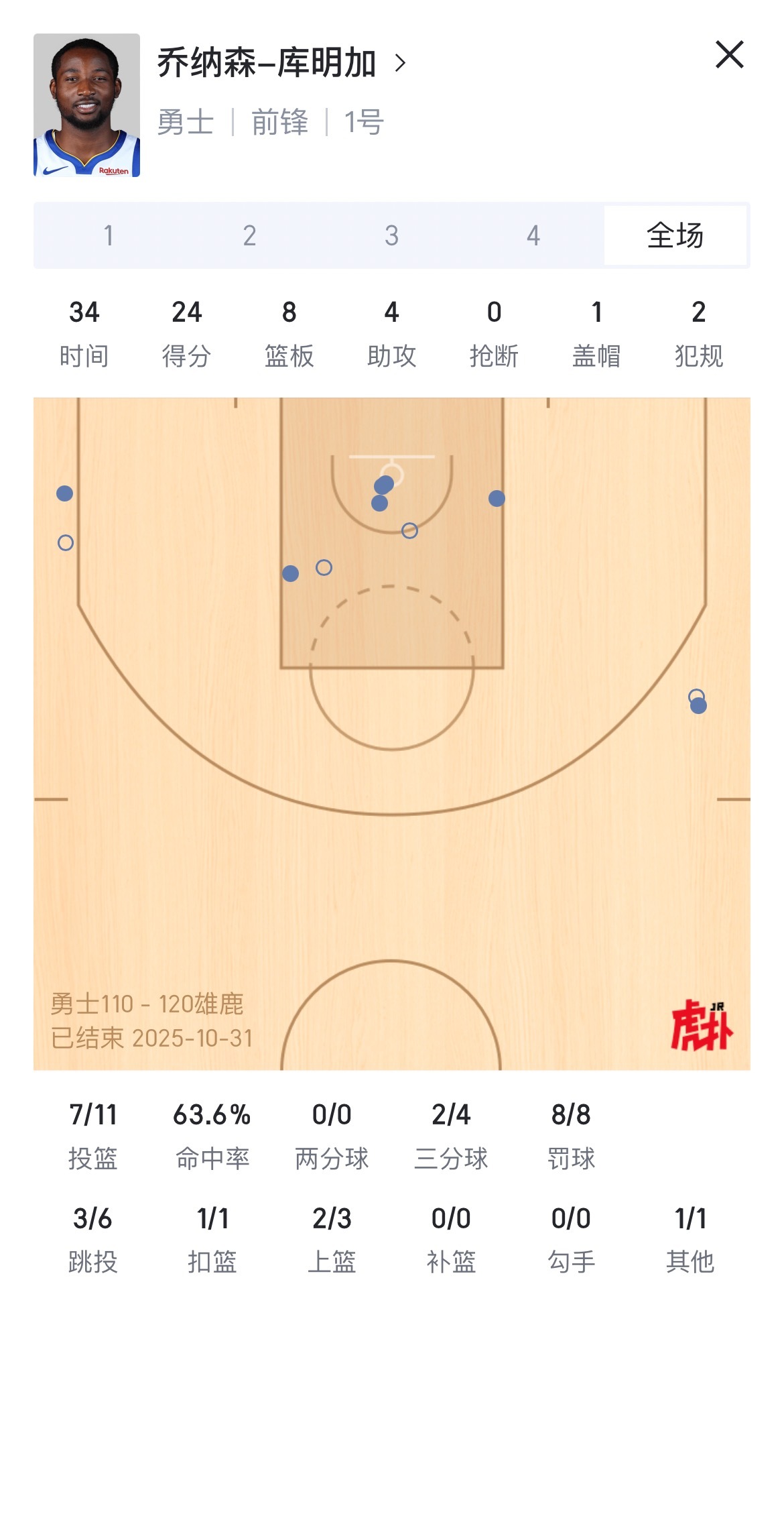 今日勇士对阵雄鹿,库明加出场34分钟得到24分8篮板4助攻1盖帽,投篮11中7,