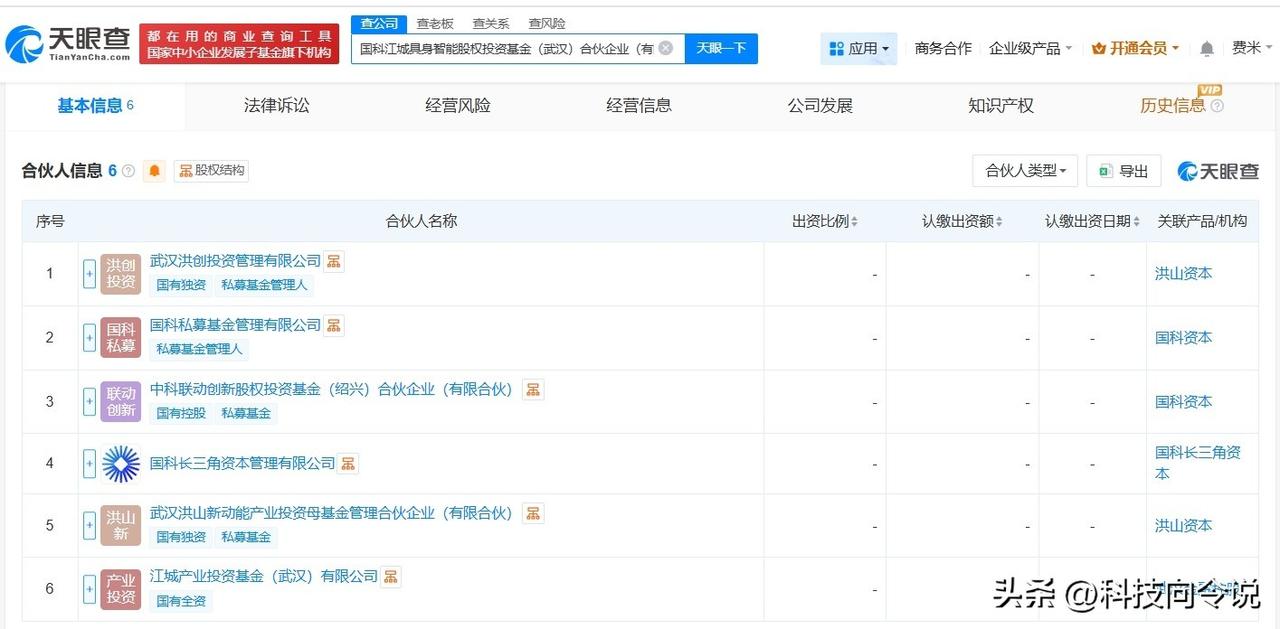 【国科江城具身智能股权投资基金登记成立 出资额8.1亿】 天眼查App显示,近日,国科江城具身智能股权投资基金(武汉)合伙企业(有限合伙)成立,执行事务合伙人为国科私募基金管理有限公司、国科长三角资本管理有限公司,出资额8.1亿人民币,经营范围为私募股权投资基金管理、创业投资基金管理服务,以私募基金从事股权投资、投资管理、资产管理等活动,信息咨询服务,由武汉洪创投资管理有限公司、国科私募基金管理有限公司、中科联动创新股权投资基金(绍兴)合伙企业(有限合伙)等共同出资。 天眼查信息: