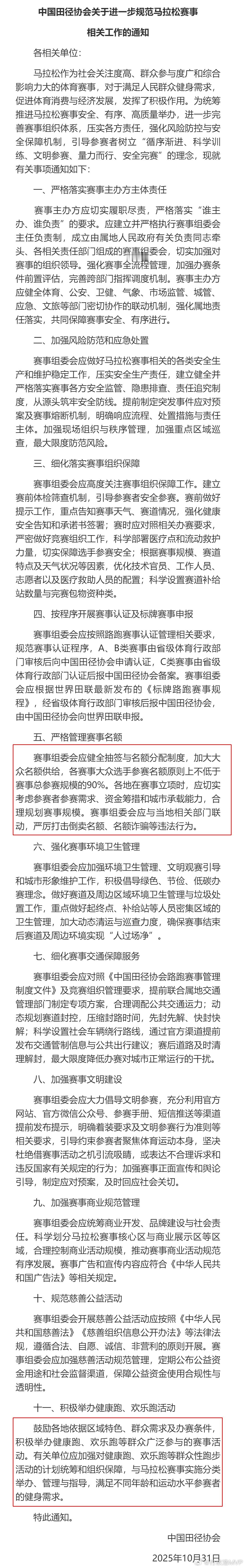 中国田径协会印发《关于进一步规范马拉松赛事相关工作的通知》,11项要求中大多数都是老调重弹、旨在进一步细化过往安全规范办赛的要求,比较有新意的是第五条:要求健全抽签与名额分配制度,加大大众名额供给,大众选手参赛名额原则上不低于赛事总参赛规模的90%;以及第十一条:要求积极举办健康跑、欢乐跑活动,满足不同年龄和运动水平参赛者的健身需求。这两条都是为了打击马拉松倒卖参赛名额乱象,确保“人民马拉松”能惠及大众。