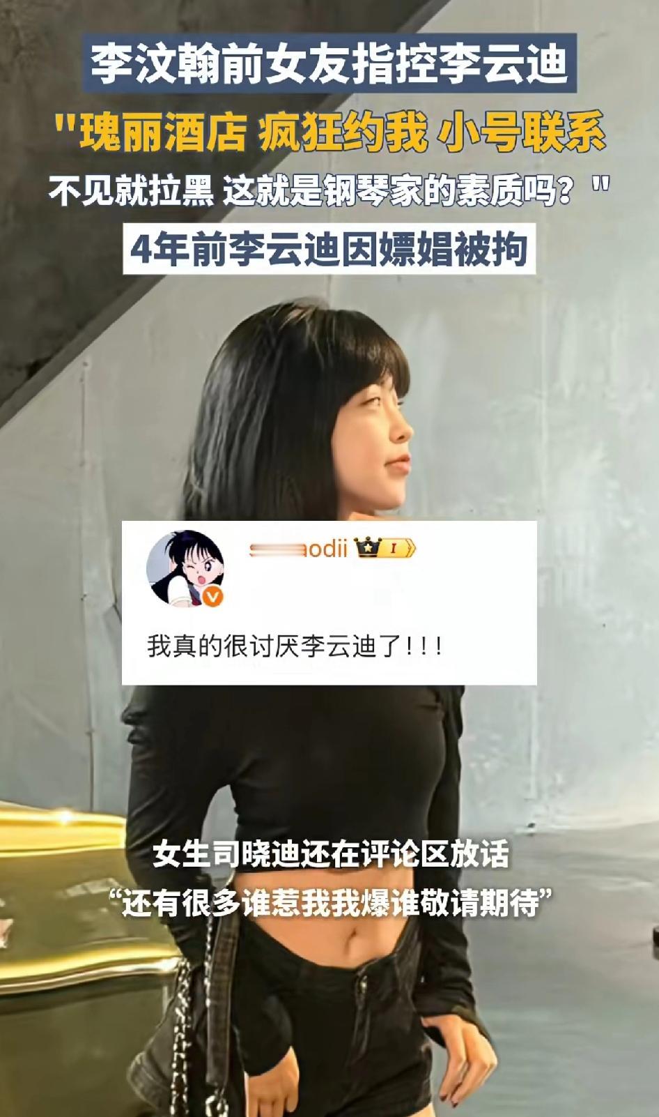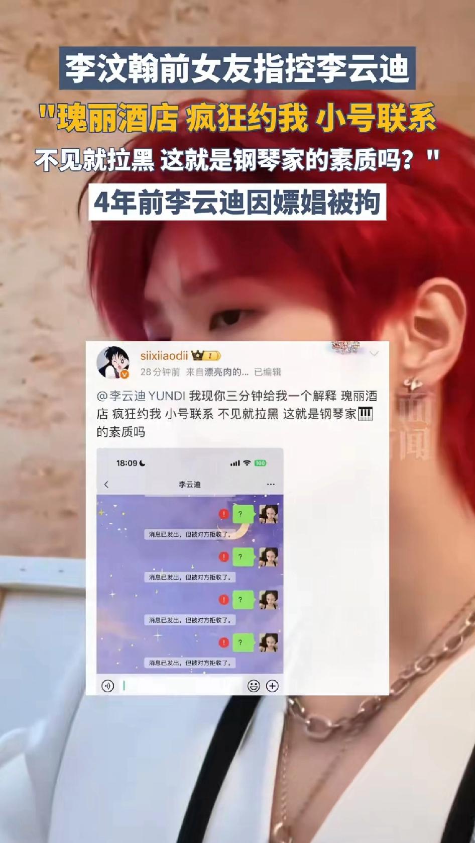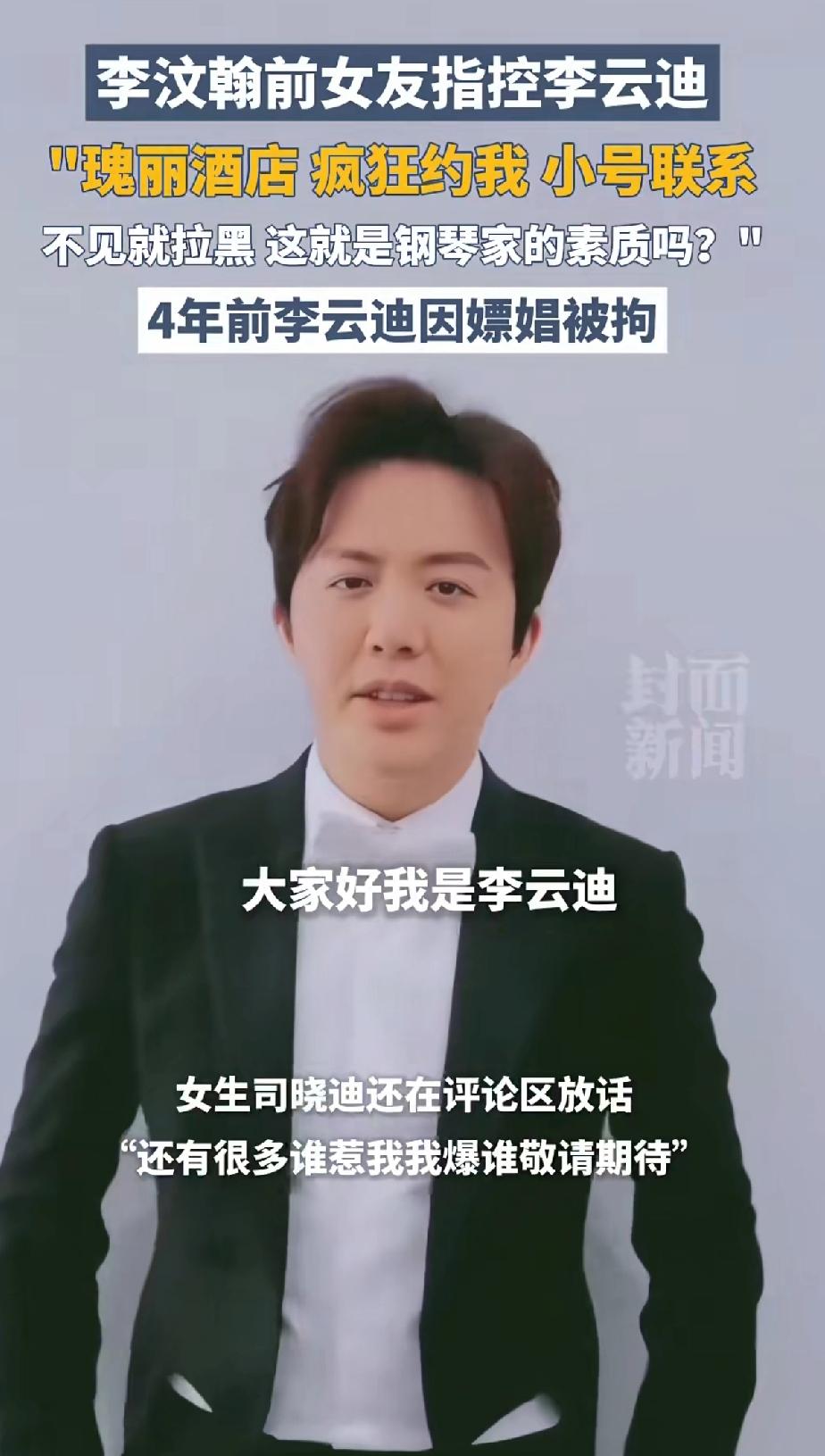 李汶翰前女友指控李云迪"玫瑰酒店 疯狂约我 小号联系" 不见面就拉黑 这就是钢琴家的素质吗? 钢琴家在大众印象里本是高雅艺术的代表,可这一系列操作哪有一点高雅的影子? 4年前李云迪因嫖娼被拘,现在又被人公然指控!还晒出聊天消息,更是@李云迪给自己解释清楚。 艺术家也有七情六欲可以理解,但如此行事实在让人难以苟同。 公众人物更该注意自己的言行举止,树立良好的榜样。 这一爆料要是真的,那李云迪的人设算是彻底崩塌了。 真希望娱乐圈和艺术圈都能多些正能量,少点这种让人三观震碎的事儿。 现在娱乐圈塌房的明星太多,男明星嫖娼出轨的比比皆是。 女明星离婚的,当第三者的也是频繁爆出。 我们吃瓜群众坐着小板凳,一个接一个的继续吃瓜!