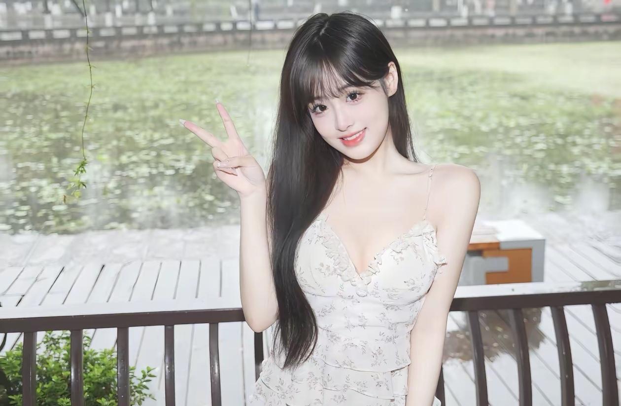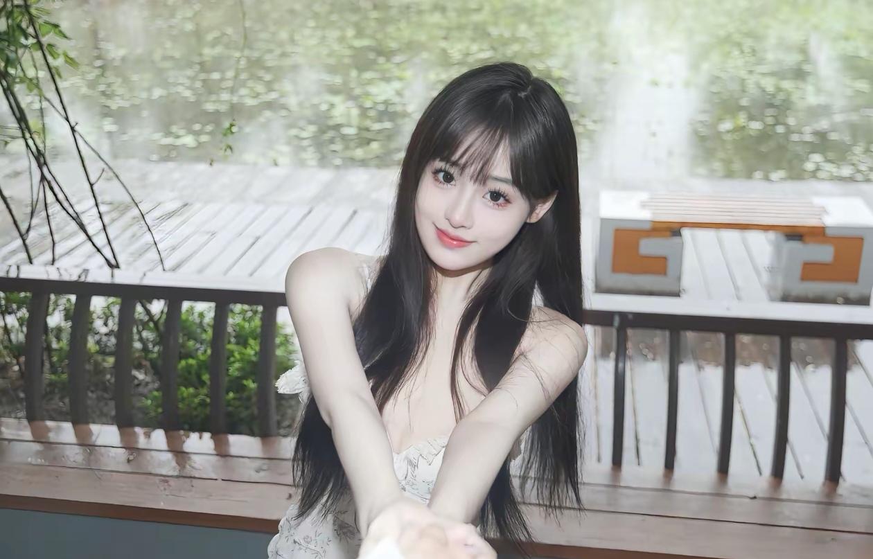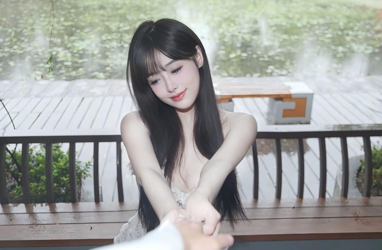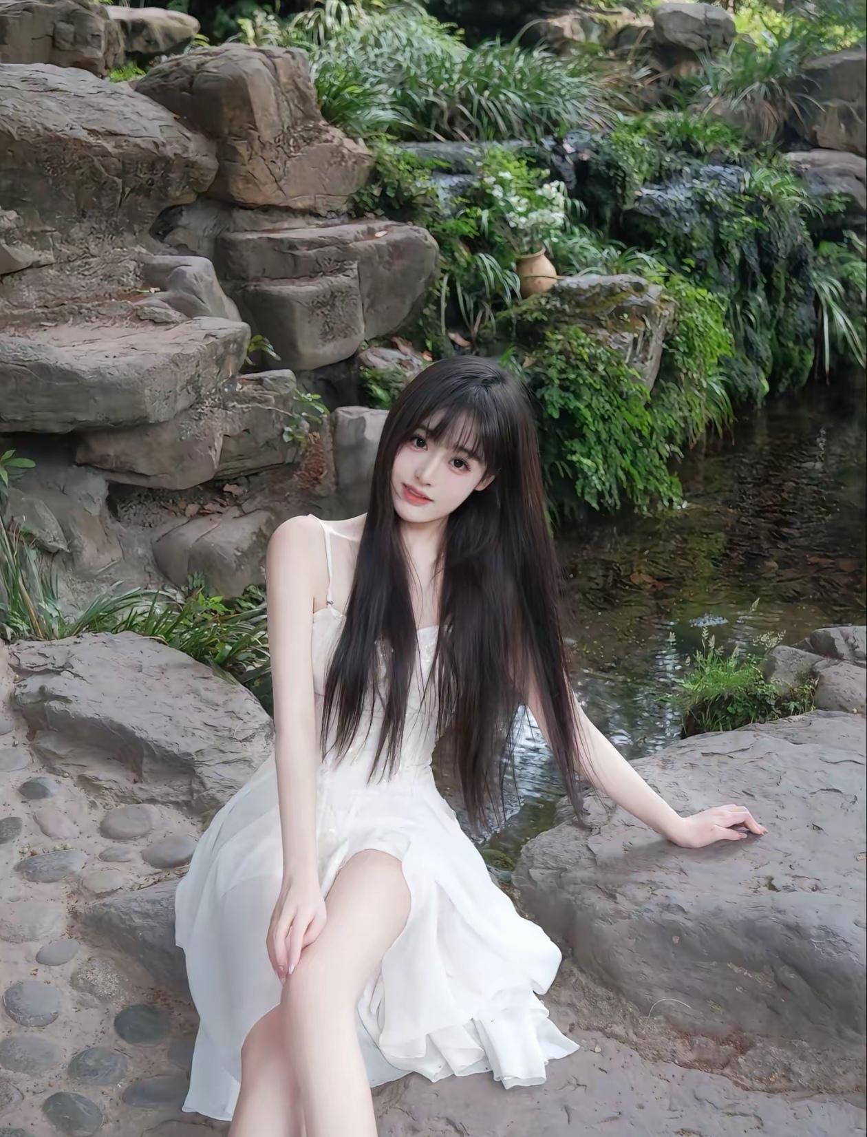 在绿意盎然的庭院中,她如仙子般静坐,裙摆轻拂,宛如梦境。