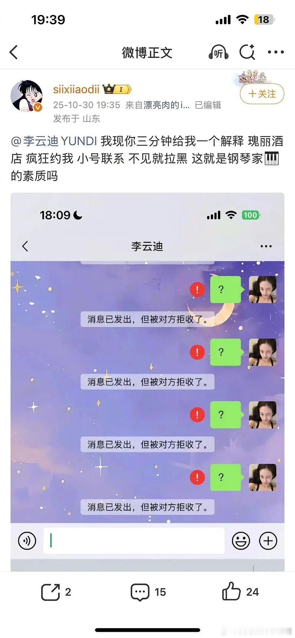 李汶翰前女友指控李云迪"玫瑰酒店疯狂约我小号联系"不见面就拉黑这就是钢琴