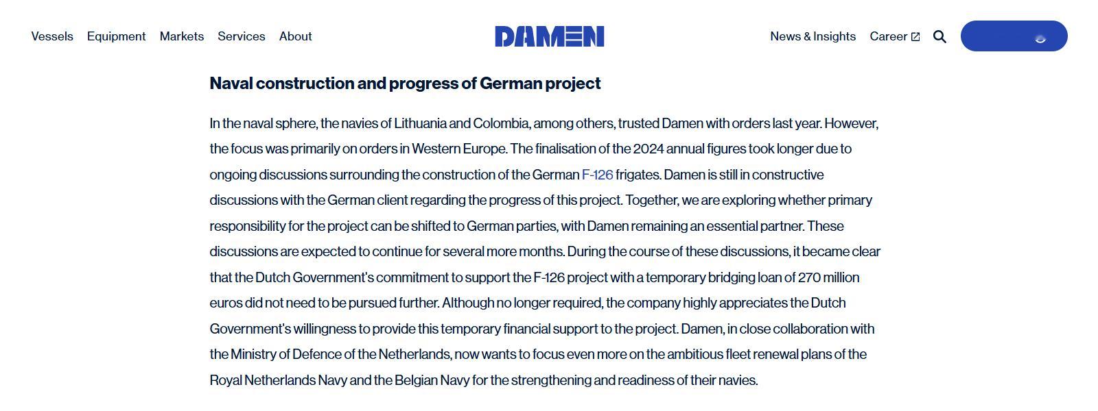 DAMEN公司的2024年度财务报表显示了良好的营收增长(图1:连续三年)(传送门👉);不过DAMEN公司也承认在德国🇩🇪海军的F-126项目上遇到了大麻烦,正在和德国🇩🇪协商移交部分工作的领导权,不过否认会完全退出F-126项目。