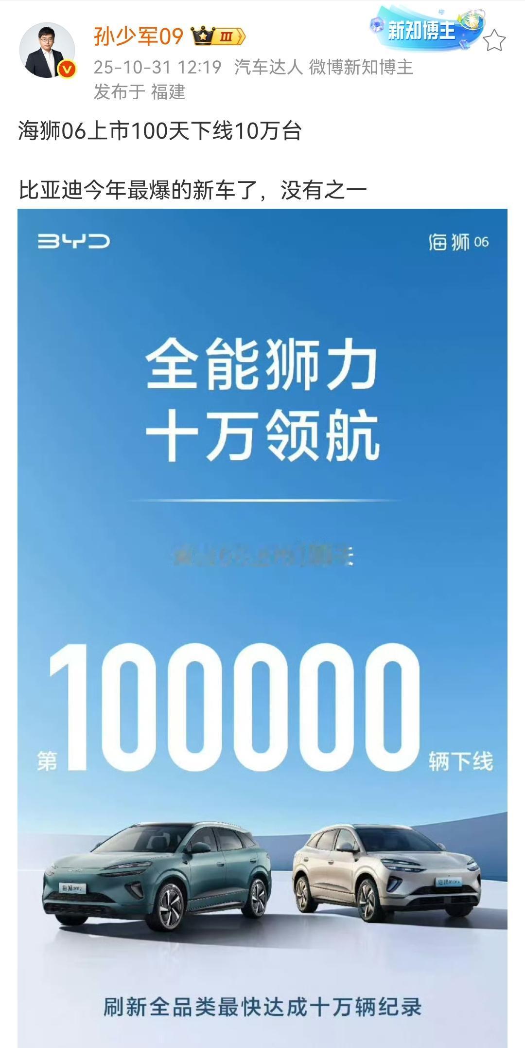 孙少军:海狮06上市100天下线10万台! 比亚迪今年最爆的新车了,没有之一​