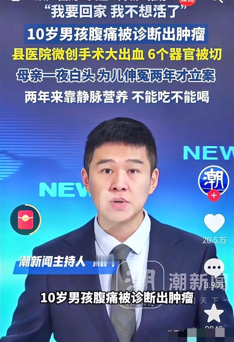 这哪是治病,分明是把10岁孩子推进了地狱!肚子疼去县医院,本是小毛病却被诊出肿瘤,一场微创直接变成14小时的噩梦,家属被逼着签了4次字,最后孩子的胃、胰腺、十二指肠等消化器官几乎被切光。更戳心的是,有说法称术后病理根本没肿瘤,好好的孩子彻底成了“无肠人”,只能靠输液续命,哭着喊“不想活了”,妈妈熬得一夜白头。医院连病历都没按时写,术前会诊也不规范,明摆着能力不够还硬揽活儿,最后赔20万就想了事,可孩子后半生的器官移植费、抗排异药钱哪来?所谓的“同等责任”更是荒唐,生死关头的签字能算自愿吗?这哪是医疗意外,是医院的轻率毁了一个家!比起赔偿,更该守住的是医院的底线,别让信任变成致命的陷阱。