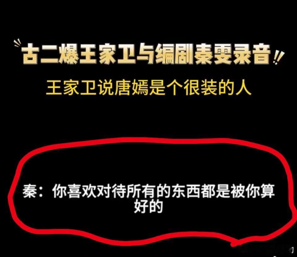 古二再曝王家卫秦雯录音这两句倒是没说错!墨镜王整天把自己弄得神神秘秘咋咋乎乎的,这些年一些喜欢捧他臭脚的把他的逼格弄的好像天上有地下无似的,他自己大概也觉得自己是啥不屑于普通人的世外高人了!实际上这么一看,这不也就是个喜欢背后蛐蛐别人捧高踩低的人精么?有啥清高的的啊?[无聊][无聊][无聊]