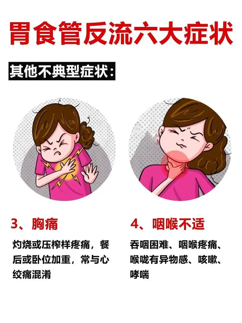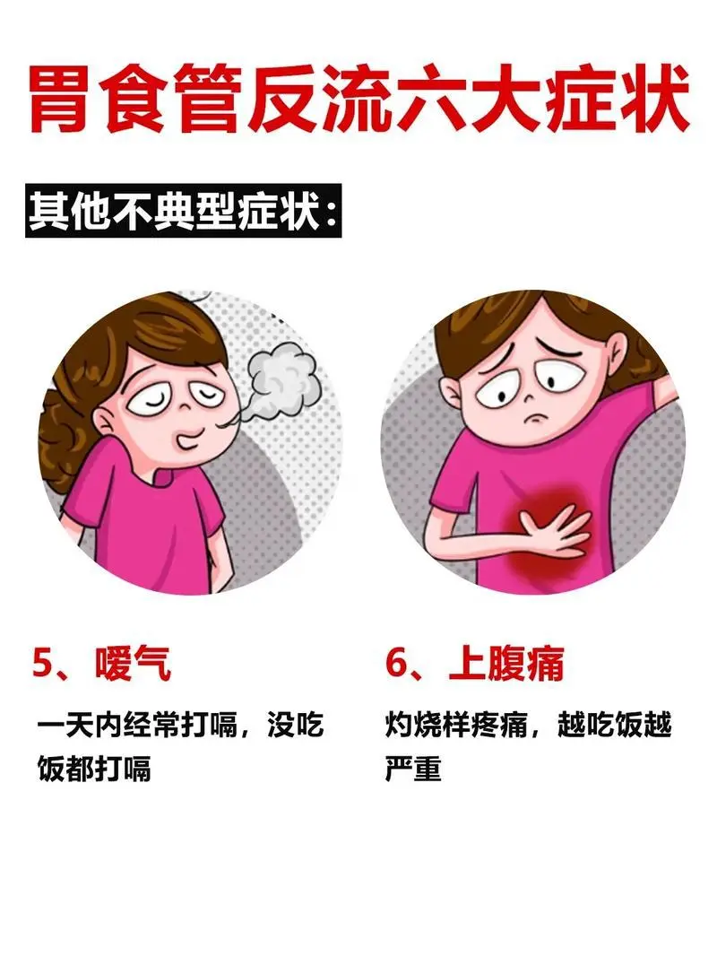 1.烧心 饭后1-2小时,明显感到胃部或胸口有火辣辣的灼热感。 2.反流 吃饭感觉顶住了,反酸水,口中有酸味和苦味。 3.胸痛 灼烧或压榨样疼痛,餐后或卧位加重,常与心绞痛混淆。 4.咽喉不适 吞咽困难、咽喉疼痛、喉咙有异物感、咳嗽、哮喘。 5.嗳气 一天内经常打嗝,没吃饭都打嗝。 6.上腹痛 灼烧样疼痛,约吃饭越严重。