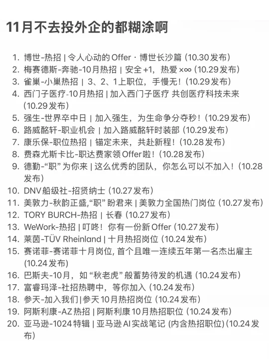 11月真的很适合冲外企,看起来求职市场没那么热了,实际上大大小小外企都在招人,图上都整理出来了,机会是真的多 . 外企呆着是真的舒服 🎯年假15天起步+圣诞额外假,六险一金顶格交,补充商业保险覆盖全家,拒绝996,女性友好,咖啡甜点自由,还有全球转岗机会,成长路径清晰 . 坚持日更✊🏻,帮大家在找工作路上顺利拿到offer! .