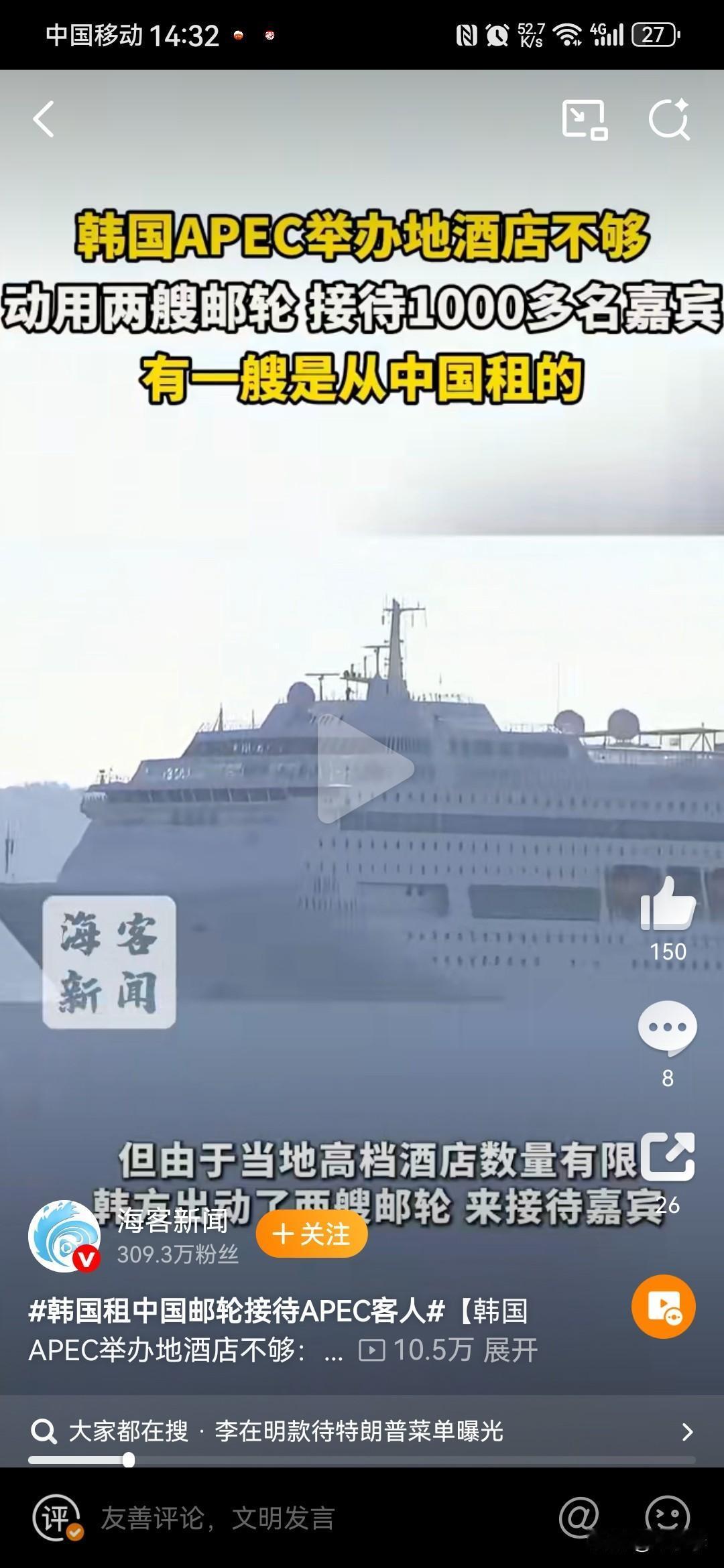 韩国APEC举办地酒店不够,动用两艘邮轮接待上千名嘉宾,其中一艘还是从中国租的。 看起来韩国举办地比不上中国京郊怀柔的雁栖湖国际会议中心。
