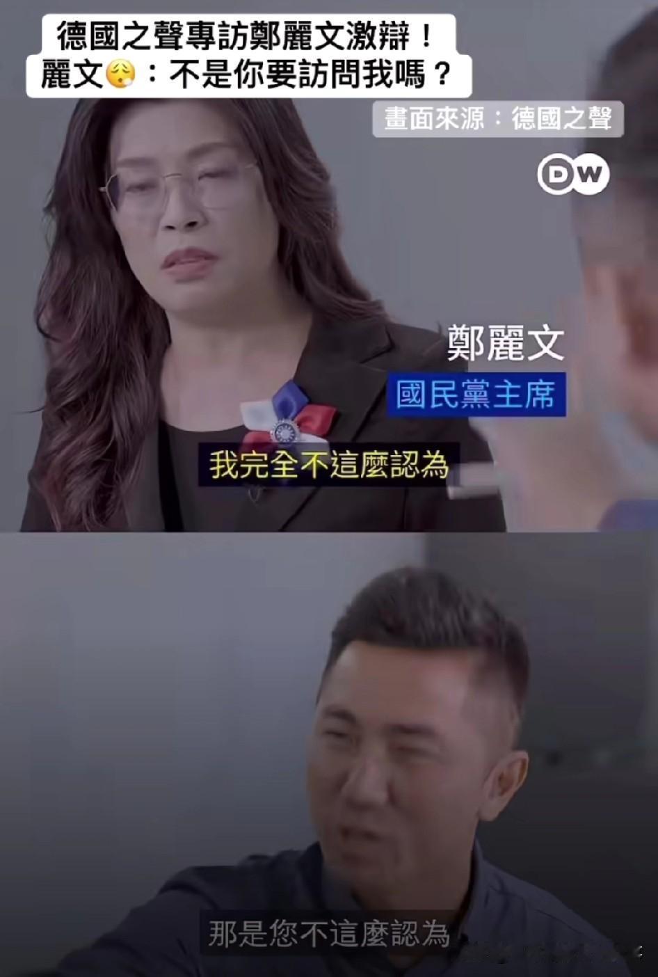 郑丽文专访怒怼德国之声记者:不是你访问我? 新当选的国民党主席郑丽文接受了德国之声的专访,采访郑丽文的是一个华裔二鬼子,老是带节奏,说什么大陆会打台湾,会变香港,预设立场给郑丽文下圈套,郑丽文冷笑回怼,我完全不这么认为,这个记者又说你不认为是你不认为,但会如何如何?郑丽文直接气笑了:不是你访问我吗?你(预设立场、不让我说我立场)你今天何必访问我? 直接把这个二鬼子说闭嘴了。 这个二鬼子还说普京是独裁者,郑丽文回应,普京不是独裁者,他也是俄罗斯人民民主选举出来的,暗讽德国之声有色眼镜! 笑死了,欧美媒体这些年总爱用一些二鬼子的华裔恶心人。