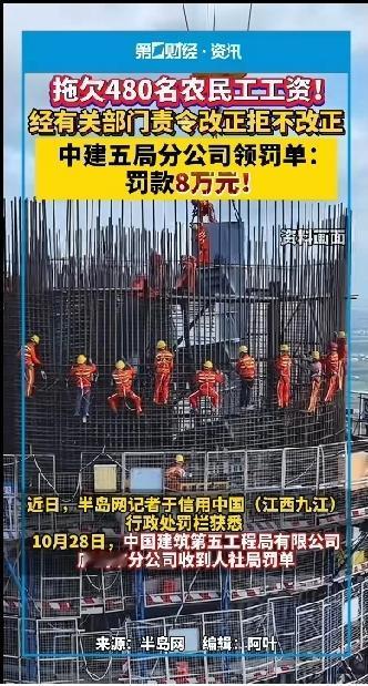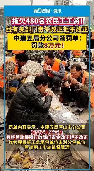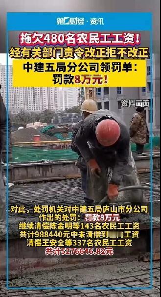 拖欠480名农民工工资被罚款8万!中建五局庐山市分公司被人社局处罚了。 原因是中建五局庐山市分公司作为项目施工总承包单位,没有对分包单位劳动用工实施监督管理,以至于发生了拖欠480名农民工工资后,劳动保障行政部门责令改正后拒不改正。 从这一点就可以看出,这家公司不仅是不把劳动法放在眼里面,连劳动执法部门,他们也没有放在眼里。 这其中主要的原因就是因为违反劳动法的成本真的是太低了,一般情况下来说,违反劳动法都是批评教育,最多也是罚款。 所以,面对劳动保障行政部门的责令改正他们根本就酶放在盐里面,至于后期这8万的处罚,对于他们来说也是毛毛雨。 毕竟,相对于拖欠的480名的农民工工资将近600多万来说,这8万的罚款连个零头都不够。 违反劳动法的成本太低了,这些企业之所以敢明目张胆的违反劳动法,是因为这些劳动者没有时间,精力,物力和财力和他们打官司。 如果想要走劳动仲裁的话,这些企业根本就不把劳动保障部门放在眼里,如果去法院起诉,那就正中这些企业的下怀。 他们巴不得这些劳动者都走法律途径,他们最害怕的就是劳动者放下法律,拿起武器,他们最不担心的就是劳动者拿起法律的武器。 这些拖欠农民工工资的企业良心都已经坏透了,因为农民工本来就非常的不容易,还经常无缘无故的被拖欠工资。 所以,强烈的呼吁相关部门行动起来,不仅要对这样的企业依法严惩,而且还应该把拖欠工资的行为写入刑法。 只有用法律进行约束,才能避免拖欠劳动者工资的行为再次发生。