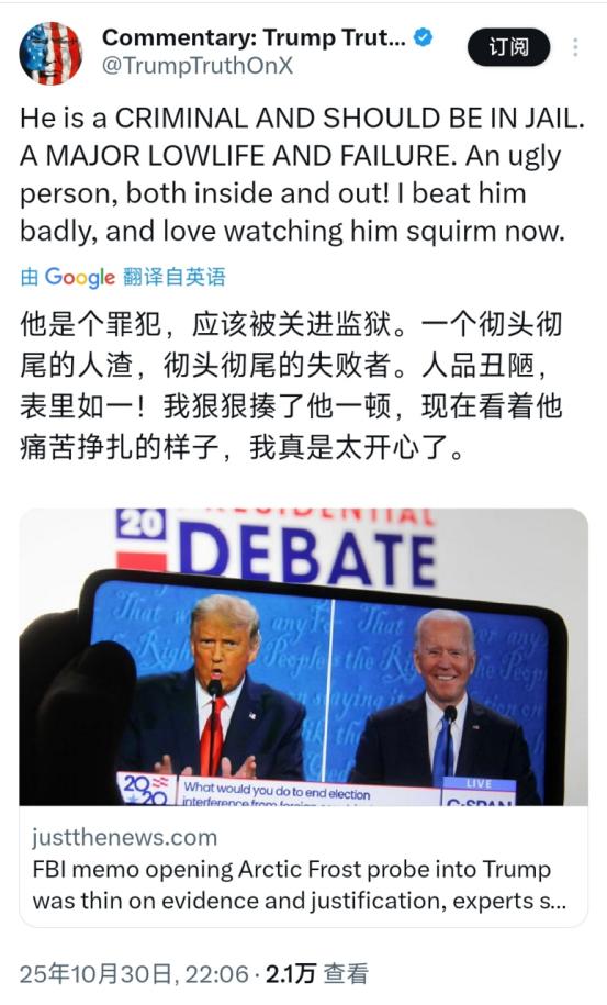 特朗普再次抨击拜登。特朗普北京时间10月30日晚发文写道:“他是个罪犯,应该被关进监狱。一个彻头彻尾的人渣,彻头彻尾的失败者。人品丑陋,表里如一!我狠狠揍了他一顿,现在看着他痛苦挣扎的样子,我真是太开心了。” 特朗普和拜登这对老冤家从2020年大选就结下了梁子,现在俩人十有八九还要在2024年大选上再掰一次手腕。这么撕破脸的骂街,其实早有苗头,但像这样直白的人身攻击,还直接给人扣“罪犯”的帽子,在最近的选战里还是头一回。 特朗普说的“罪犯”“该关监狱”,也不是瞎咧咧,明眼人都知道他指的是啥——拜登儿子亨特那一堆烂事,还有之前闹得满城风雨的“自动笔赦免令”破事。 虽说之前司法部发过话,说总统用自动笔签字没法律问题,好几位前总统也这么干过,但特朗普偏要揪着不放,一口咬定拜登卸任前签的部分赦免令是自动笔写的,根本不算数,还说这就是“犯罪证据”,说白了就是想把司法事儿搞成政治攻击,往拜登身上泼脏水。 更扎心的是“彻头彻尾的失败者”这句评价,这话可不是随口污蔑,手里攥着的经济数据就是他的底气。2024年美国经济表面上瞧着还行,前三季度GDP增速分别是1.6%、3.0%和2.8%,但骨子里早就烂透了。 个人消费是拉动增长的主力,可增速已经慢下来了,透着股乏力劲儿,亚特兰大联储都预测四季度这股拉动作用还得往下掉;私人固定投资更惨,环比增速从一季度的1.6%跌到三季度的0.4%,新开办的企业数量还在一个劲往下滑,企业家们的信心低得没法看。 最要命的是制造业,除了3月勉强过了枯荣线,其他月份全在收缩区里打转,也就食品饮料和计算机电子这两个行业还在往上走,产能利用率比长期平均水平低了快2个百分点,想恢复过来不知道要等到猴年马月。 老百姓最关心的通胀和就业也没好到哪儿去。2024年通胀降得磨磨蹭蹭,急死人,10月甚至又往上冒了冒头,黏性核心CPI同比涨了3.87%,比整体CPI还高,美联储定的2%目标简直是没影的事。 密歇根大学的调查显示,大家觉得未来一年通胀还得有2.6%,根本不相信能快降下来。 就业市场看着稳当当的,失业率在3.7%到4.3%之间晃悠,但10月只新增了3.6万个非农就业岗位,虽说11月反弹了点,可全靠医疗和酒店业撑着,劳动参与率比疫情前还低0.6到0.8个百分点,说白了就是不少人干脆躺平不找工作了。 更吓人的是政府债务,2024财年赤字就有1.83万亿美元,创下疫情后的新高,债务总额突破36万亿美元,光利息就快把财政压垮了。 这些事老百姓都看在眼里,自然成了特朗普攻击拜登的最好靶子。 特朗普说自己“把他揍得落花流水”,这话也不是纯吹牛皮。看民调就知道,拜登的支持率就没怎么高过,尤其是在经济这事上,不少选民都觉得他的政策没屁用。 贸易逆差还在一个劲往大了涨,2024年1到10月累计赤字7359亿美元,比去年同期涨了12.3%,光货物贸易逆差就有8865亿美元。特朗普一直骂拜登贸易政策太软,现在正好拿这些数据堵拜登的嘴。 更关键的是,特朗普在共和党内部的支持率稳得很,之前就算吃了好几起刑事官司,也没动摇他候选人的位置,反倒让他把自己塑造成“被民主党政治迫害的受害者”,拉了不少保守派选民的支持。 再看拜登,民主党内部虽说没明着拆台,但早就有人对他的年纪和执政效果犯嘀咕,这次被特朗普这么一顿臭骂,支持者的信心肯定又要受打击。 最倒霉的恐怕得是美国的那些企业家们,跟当初跟着德国外长准备访华结果落空的德国老板们一个德性。2024年企业日子本就难熬,制造业收缩、投资也不敢动,大家都盼着大选早点有个准信,好摸清楚未来的政策路子。 结果特朗普这么一闹,选战的不确定性又加了码。关税、移民、税收这些直接关乎企业死活的事,现在全成了未知数。做进出口生意的怕关税变来变去,搞制造的怕移民政策一收紧,劳动力更不够用,中小企业则怕税收政策调整。 本来企业家信心就低,这么一折腾,刚有点起色的信心又得掉下去。之前美国企业首席执行官信心指数从4月到11月一直趴在低位,好不容易12月刚有点回暖的意思,这下估计又得凉。 更关键的是,这波骂战不只是他俩的私人仇怨,还得搅乱美国的政治格局。特朗普这么狠的骂法,只会让两党斗得更凶,本就分裂的民心更没法往一块凑了。 而且特朗普的心思不只是骂赢拜登,更像是借骂战给自己造势——2024年大选经济是关键,把拜登钉死在“失败者”的标签上,他自己就能顺理成章地兜售自己的经济主张。 拜登要是拿不出实打实的成绩反驳,特朗普扣的“失败者”帽子,恐怕真要牢牢粘在拜登头上了,而美国接下来的经济走向,也会因为这场乱糟糟的选战变得更没个准头。