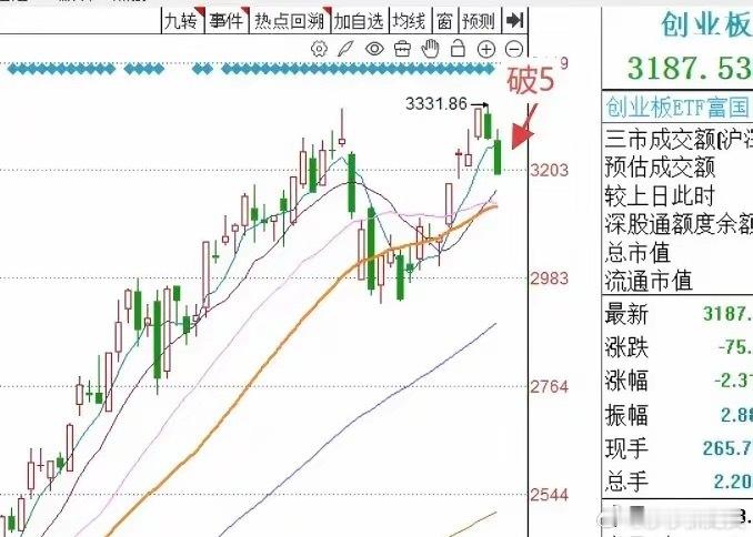 第三,从图三创业板指深成指的角度来分析。我们以创业板指为例,创业板指在当前位置形成日线级别,双头的可能性正在增加。我们可以看到今天创业板指明确的跌破了5日均线。这种跌破5日均线的动作,往往意味着短线调整的开始。