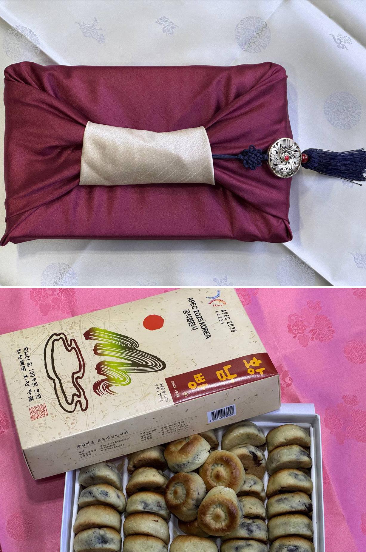 韩国在APEC峰会送的“伴手礼”——庆州特产“皇南饼”,据了解,皇南饼以柔软的外皮和香甜的红豆馅著称,是庆州最具代表性的传统糕点之一。