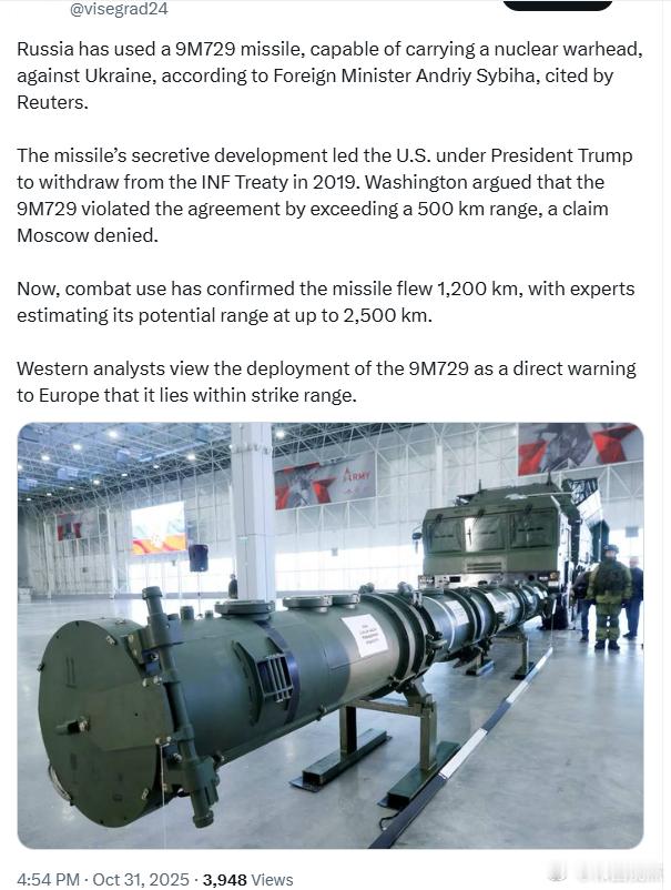 路透:俄罗斯已对乌克兰使用了一枚可携带核弹头的9M729导弹。